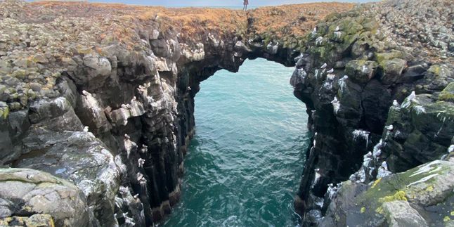 После — побережье полуострова Снайфедльснес: пляж Утри-Тунга, где часто отдыхают тюлени, и Арнарстапи — элегантная прибрежная деревня с лавовыми арками и видами на Атлантику.