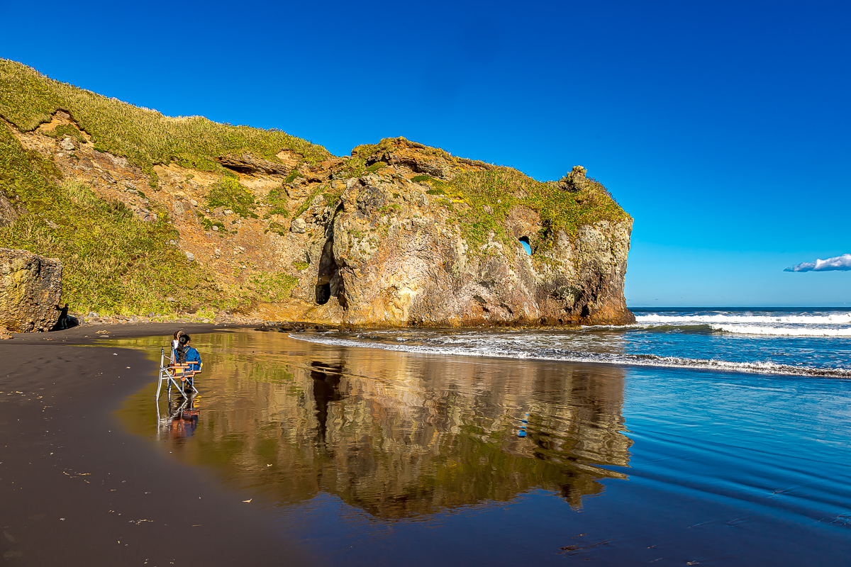 Затеммы пересечем весь остров к побережью Тихого океана. Вас ждет залив Касатка и легендарный Зеркальный пляж. Тонкий слой воды на черном песке создает эффект неба под ногами. Мы исследуем загадочные штольни мыса Тоннельный и увидим занесенный песком буксир Корунд.