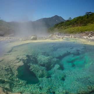 А ещё вы увидите геотермальную станцию и озёра Голубые глазки, откуда начинается сернокислотная река Кипящая. Здесь будет привал — после нелёгкой дороги вы сможете отдохнуть в бурлящей ванне термальных источников у подножия вулкана Баранского. Ванночки расположены в очень живописном месте, среди величественных сопок и могущественной тайги. Температура в них — около 42 C. Пообедаете здесь же, в окружении вулканов.