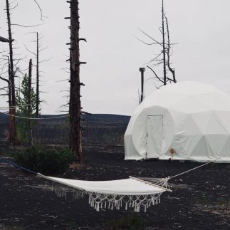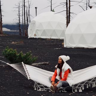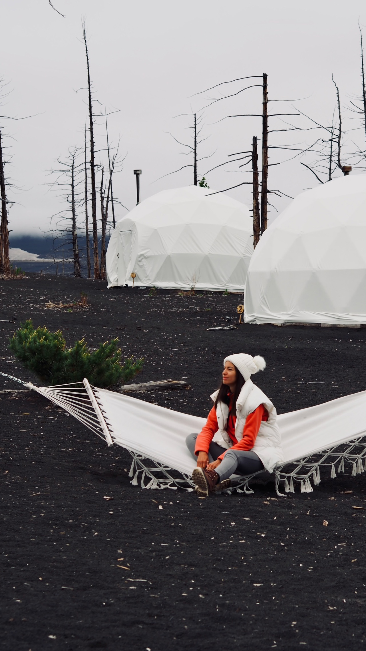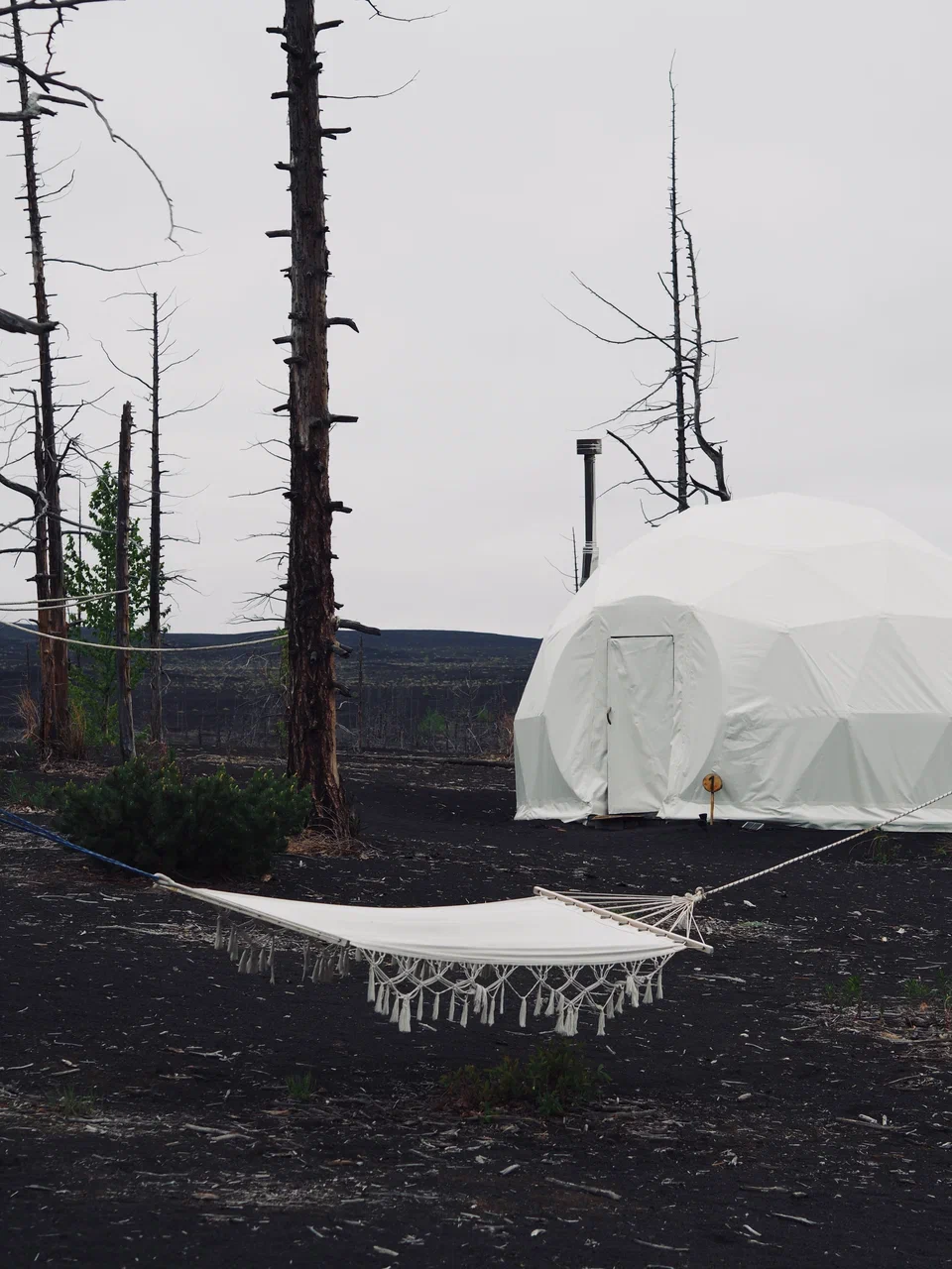 Толбачик славится своей черной землей, которая появилась из-за вулканического пепла. Причем такой цвет можно наблюдать даже в радиусе 50 км от кратера. Вулкан довольно активный, часто извергается, является действующим.В 70-х в окрестностях вулканического массива построили исследовательскую базу с площадкой для испытания луноходов и марсоходов. Ученые считали, что шлаковые поля Толбачика похожи на лунный грунт. К сожалению, базу накрыл лавовый поток в 2012 году.Заселяемся в глэмпинг на территории вулканического массива, но без удобств. Это лучший вариант, ведь если выбирать что-то другое, то это только палатки. Других объектов размещения здесь попросту нет!Готовьтесь к перезагрузке. В ближайшие дни связи и интернета не будет, придется жить без телефонов. Они нам потребуются только для фото.