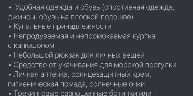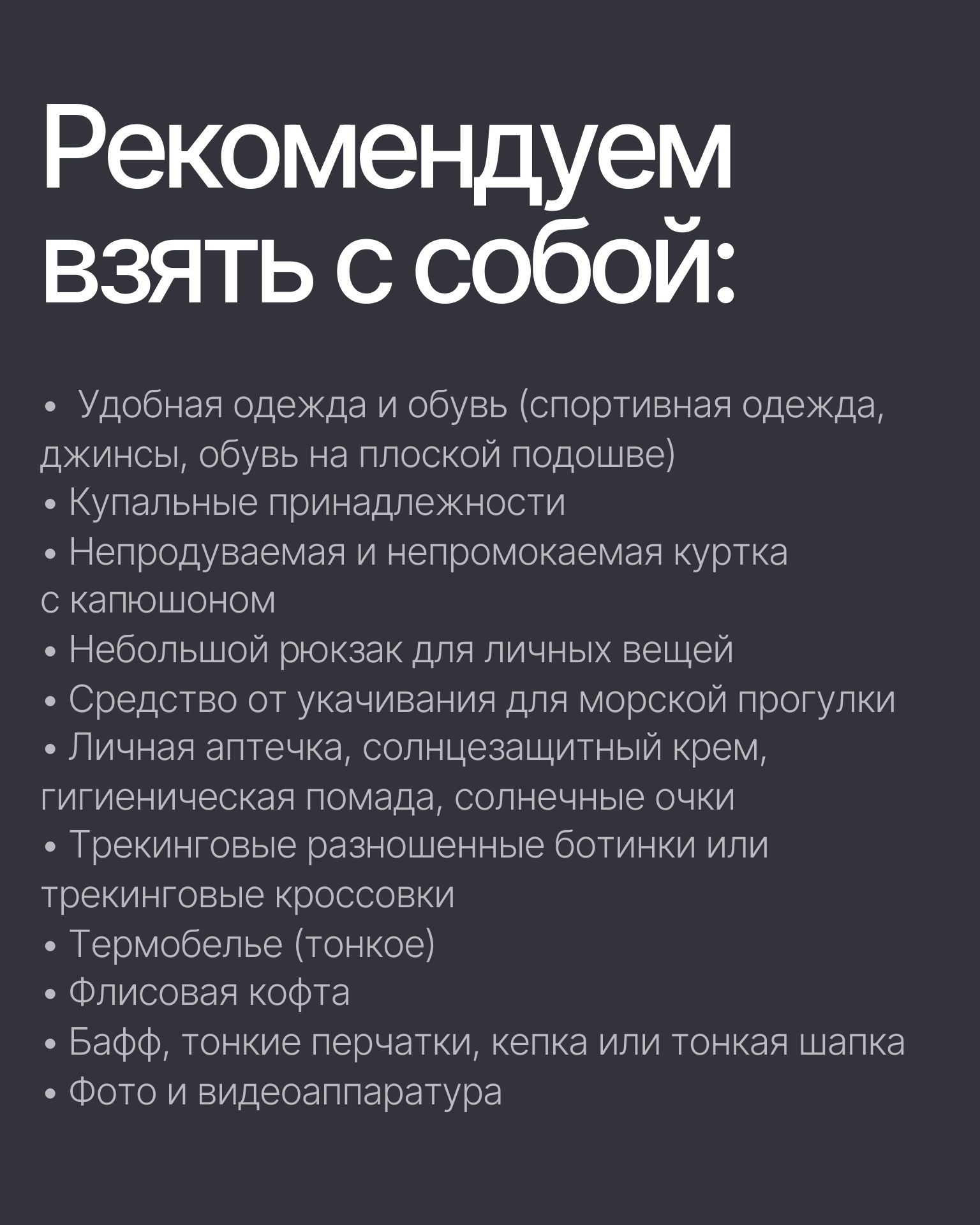 Экипировка: теплая одежда и обувь, солнцезащитные очки, шапка, тапочки, полотенце, купальник/плавки.