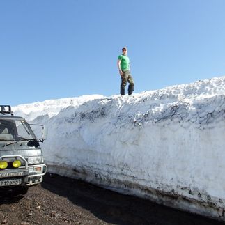 Несмотря на то, что летний сезон уже начался, но на вулканическом плато в июне еще весна, и снег еще продолжает таять. Поэтому за перевалом передвигаться будем на снегоходах с нартами.