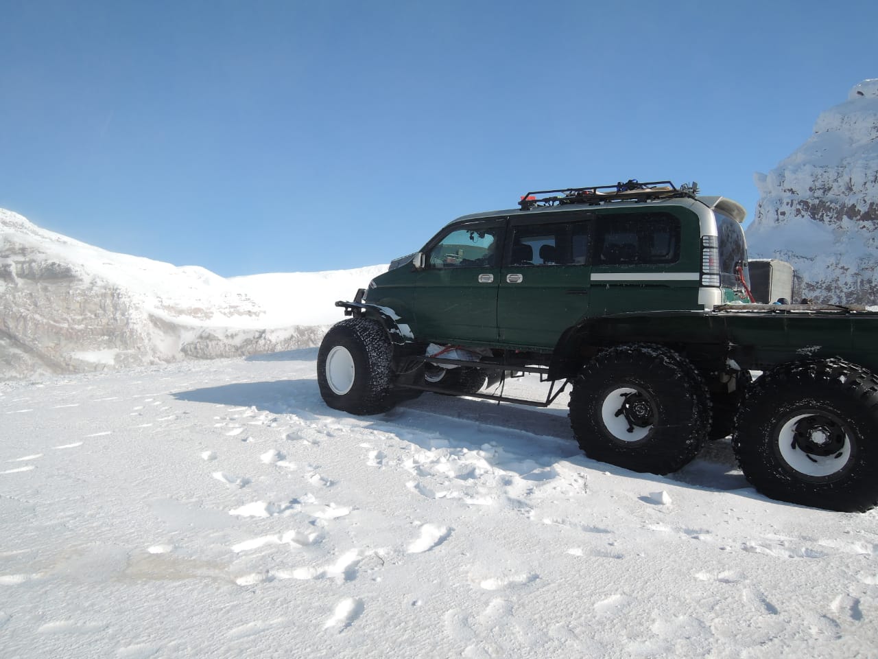 Тур На 6-ти Колесном Вездеходе -Это Пожалуй единственная возможность побывать в активной фумарольной Зоне в вулкана Мутновский . насладиться зимним Пейзажем Горных массивов и ощутить всю дикость и неприкосновенность Земли Санникова