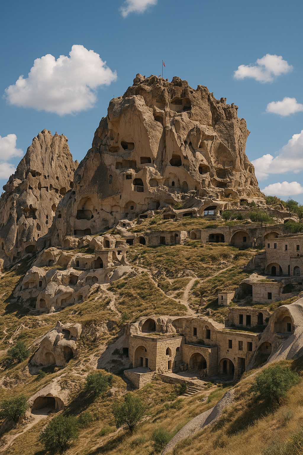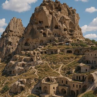 Скальная крепость Учхисар и пещерный дом Дальше едем к Учхисару - гигантской скале-крепости, внутри которой веками жили люди. Прогуливаемся у подножия, рассматриваем окна в скале и ходы, которыми жители передвигались между уровнями. Заглядываем в настоящий пещерный дом: видим, как были устроены комнаты, где спали, как хранили еду и почему в такой нырке комфортно и зимой, и летом. Очень наглядный урок минимализма по-каппадокийски.