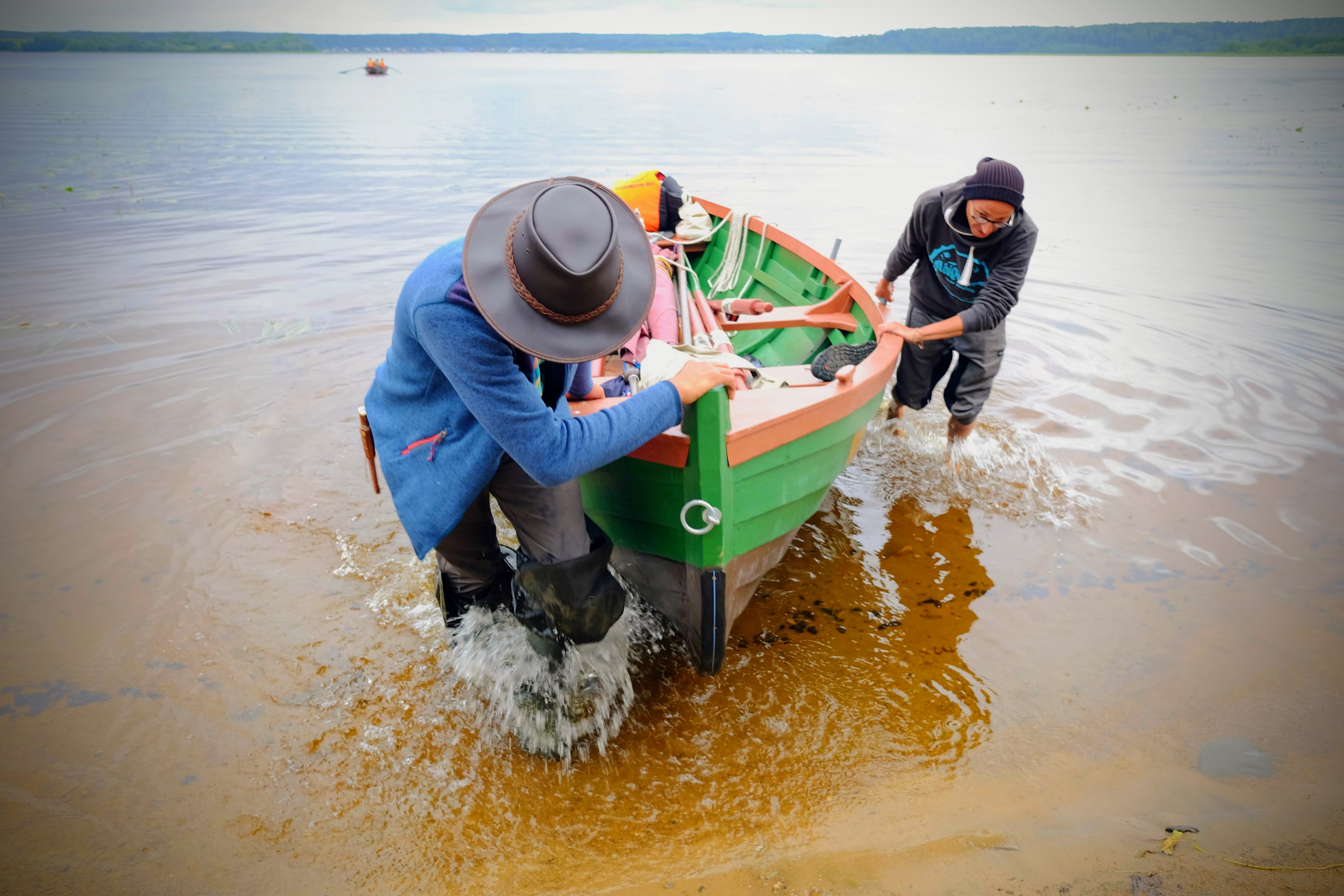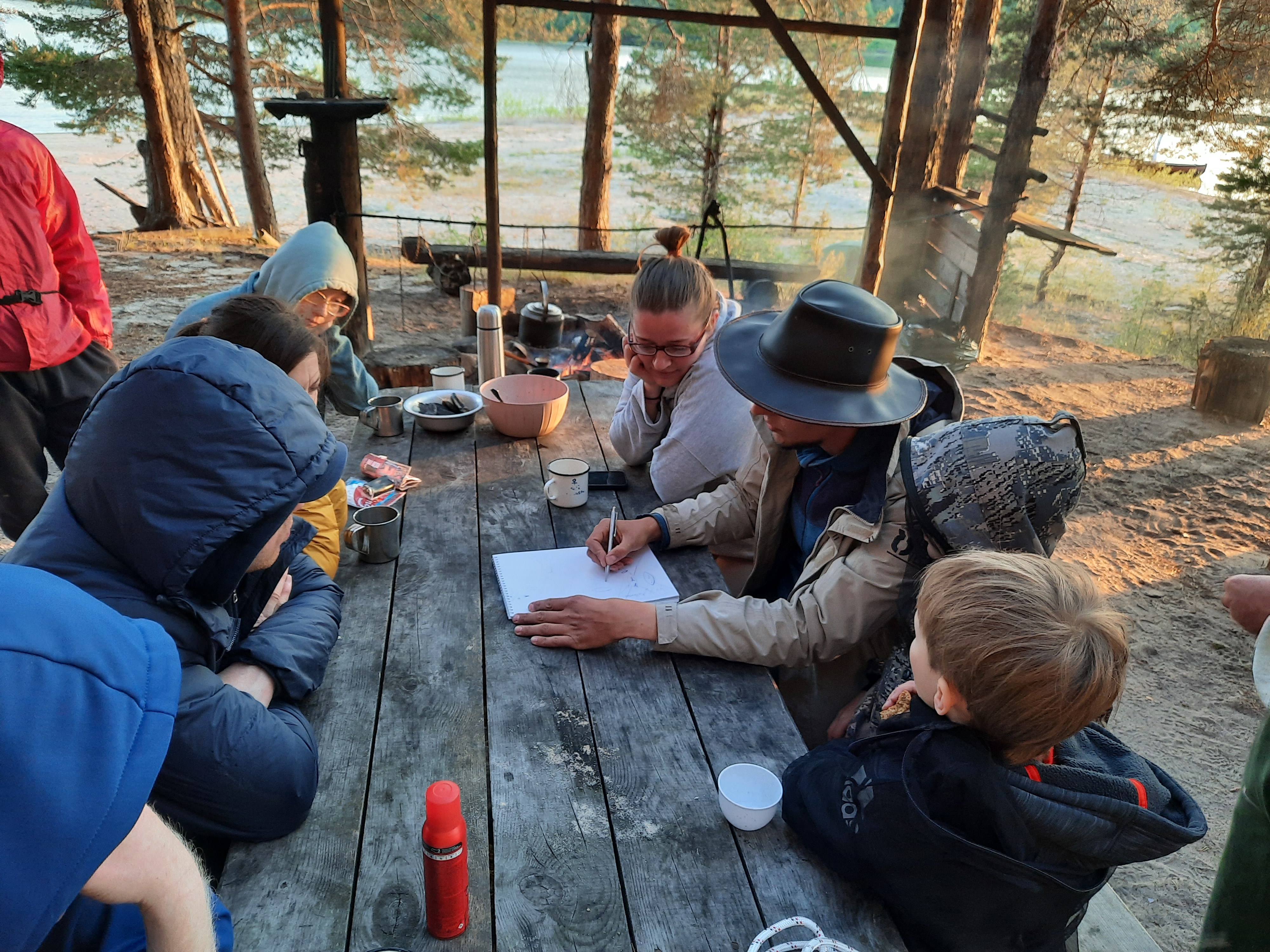 На суше: Команды карбасов швартуют лодки, забирают личные вещи, ставят лагерь и располагаются. Затем вместе готовим обед/ужин. Всё это время командам помогает старший помощник и капитан, поэтому если участник не умеет ставить палатку, мы поможем.