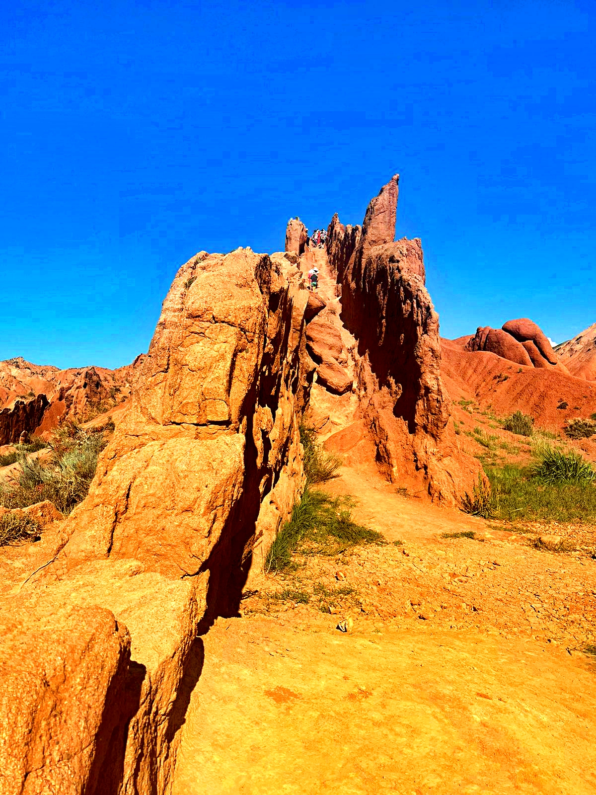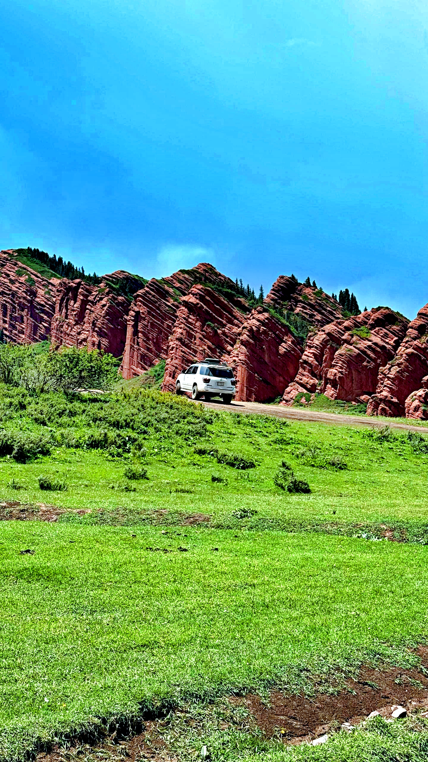 Взобравшись на самый верх, откроется потрясающий вид на озеро Иссык-Куль. С одной стороны красные горы, а за ними снежные пики и зеленые луга.
