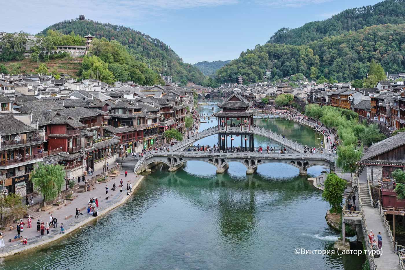 Вдоволь налюбовавшись очаровательными пандами мы возвращаемся в город и отправляемся на прогулку по Фэнхуану. Древний город Фэнхуан это реальность и фантазии, история и легенды. Этот городок, названный в честь мифической птицы феникс, действительно напоминает декорации к старинной китайской сказке. Он уникален и живописен, окружён горами, но напоминает Венецию. Это волшебное место считается самым красивым в Китае. Кажется, что время здесь замерло. Здания на сваях, традиционные одежды, деревянные лодки, узкие улочки, вымощенные булыжником ничто не напоминает о современности и техническом прогрессе.