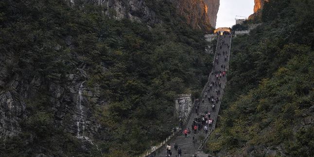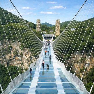 Подвесной стеклянный мост длиной 536 метров в районе большого каньона Чжанцзяцзе. Под ним ущелье глубиной 300 метров. Мост установил множество мировых рекордов для стеклянных мостов. Национальный парк Тяньмэнь, где возвышается гора Небесные врата с гигантской сквозной пещерой. Образовалась она в 263 году в результате землетрясения, и с тех пор этой местности придают мистическое значение. К Небесным вратам ведут 999 ступеней, а на вершину горы Тяньмэнь серпантин 99 поворотов. Но вы подниметесь по канатной дороге, которая считается самой длинной в мире. Часть опоясывающей гору тропы стеклянная. С вершины открываются восхитительные виды.
