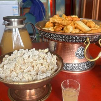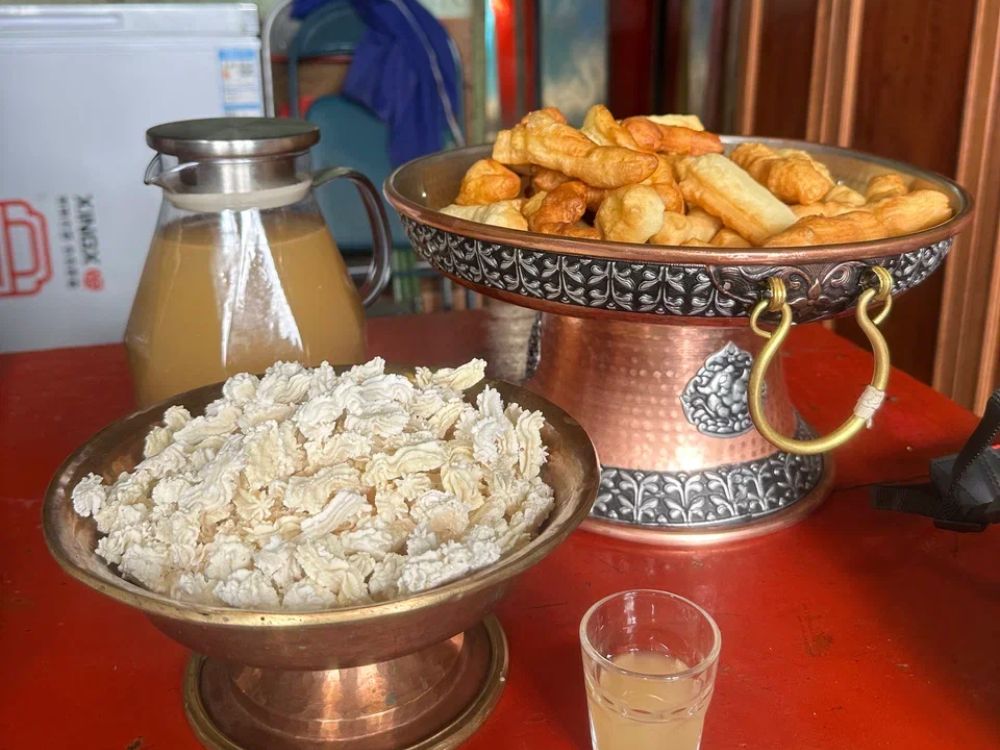 Обедаем у тибетской семьи: цзампа, шапале, тукпа и чай с маслом яка. Хозяева угощают лёгким чангом и домашним сыром.