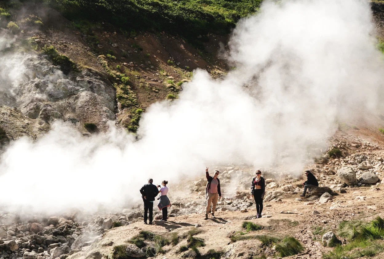 Переезд занимает порядка 2 часов, по пути сделаем несколько остановок на смотровых площадках. Выход на маршрут, который начинается сразу от геотермальной станции. По плотной пешеходной тропе мы пройдем к началу фумарольного поля. Именно здесь расположены грязевые котлы, кипящие фонтанчики, а склоны покрыты разноцветной глиной.