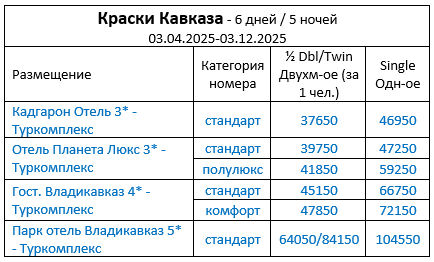 - Авиаперелёт / жд билеты. При покупке авиабилетов необходимо выбирать рейсы с прибытием в день начала тура во Владикавказ с 8:00 до 14:00 и вылетом из Минеральных Вод по окончании тура вечером после 18.00