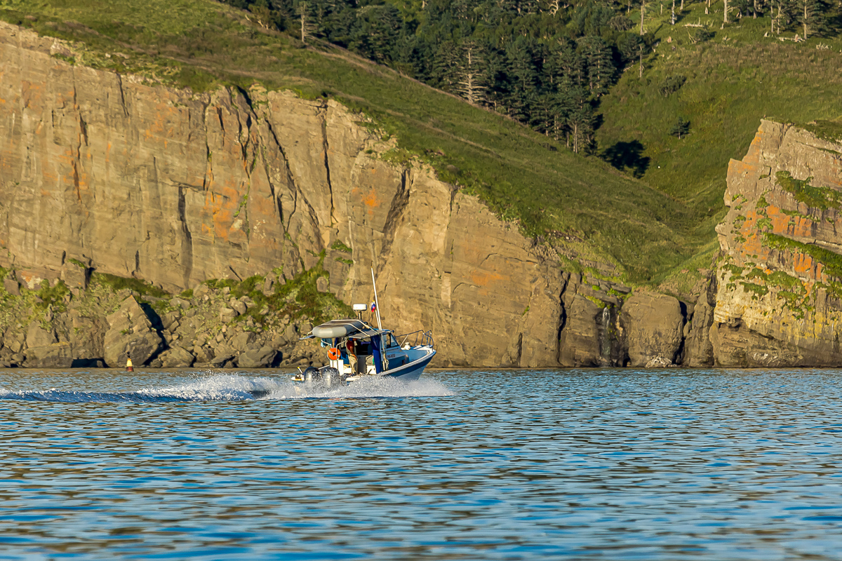 С утра садимся на теплоход и отправляемся в следующий морской круиз. Этот переход короткий и обычно все наши гости проводят его на палубе. Сначала мы посмотрим на Кунашир, с борта очень хорошие виды на вулкан Менделеева и вулкан Тятя, а через пару часов нам откроется Шикотан. На этом небольшом переходе через Тихий океан часто можно увидеть дельфинов.