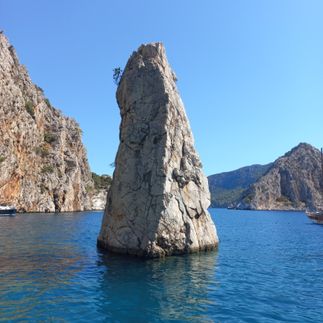 Весь день идём вдоль живописных бухт с возможностью спускаться и купаться в каждой - вода кристальная, берега уединённые. По пути достигаем древнего города Семена: осматриваем средневековую крепость на холме и затонувшие ликийские саркофаги, частично погружённые в море - зрелище завораживающее.