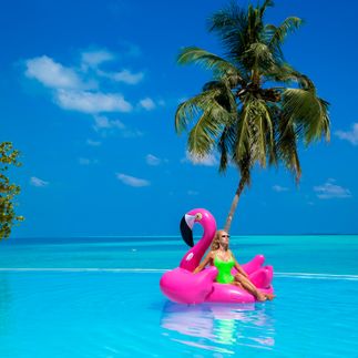 фото в стиле открытка с Мальдив на фоне водных вил и бассейнов