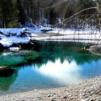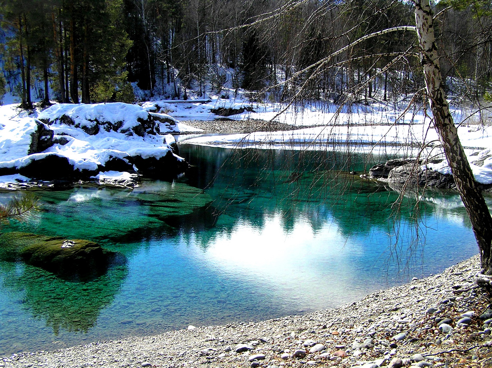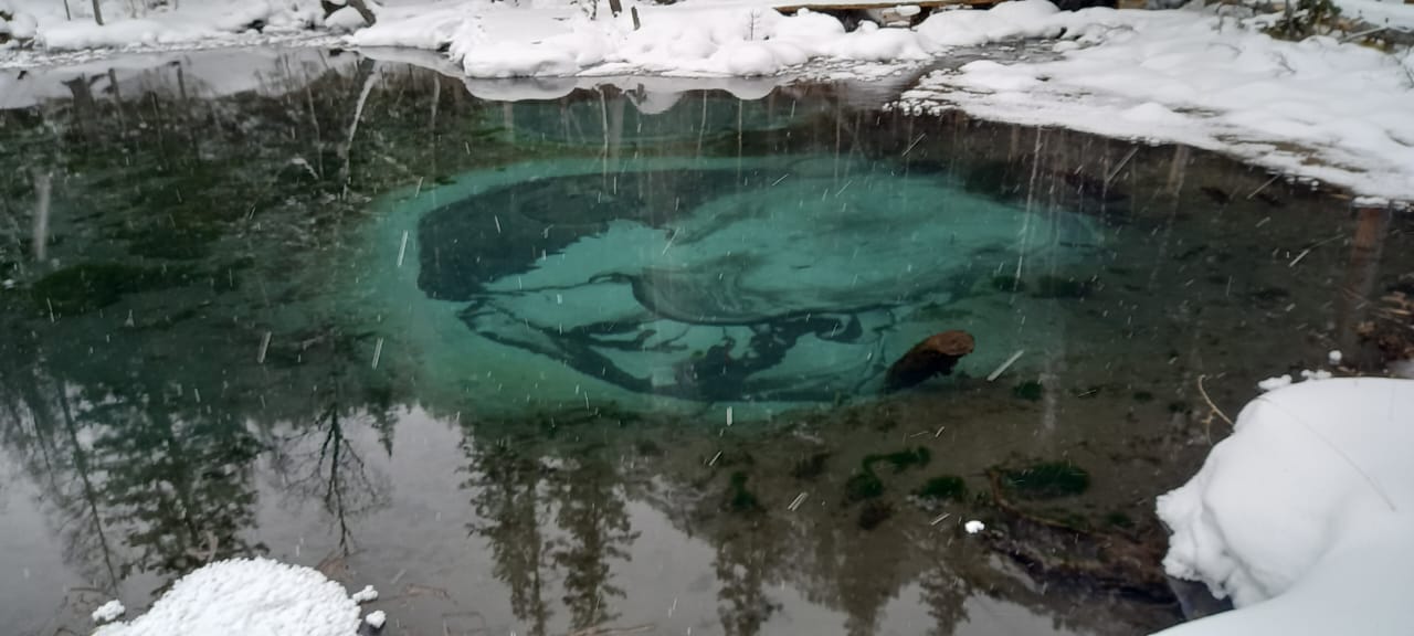 Посетим Голубые озера, с романтичным названием Глаза Катуни. Озера находятся на левом берегу Катуни, недалеко от с. Аскат, появляются осенью при малом уровне воды в Катуни и существуют всю зиму, до весеннего паводка, зимой они не замерзают из-за теплых источников. У самых отчаянных есть возможность отметить начало путешествия купанием в бирюзовой воде горных озер