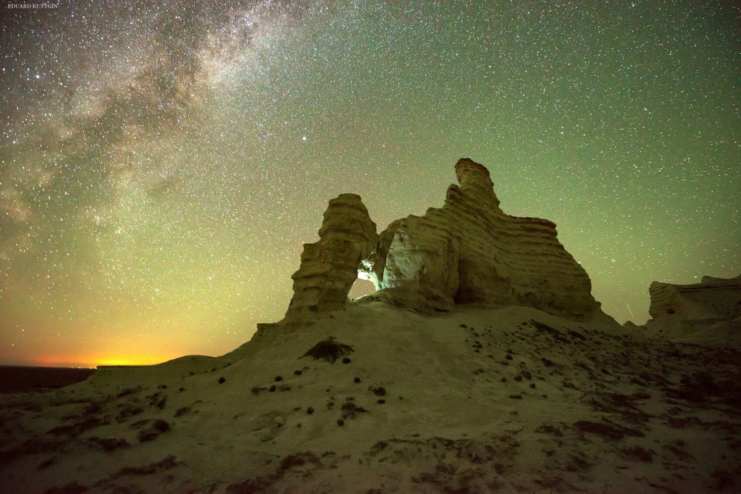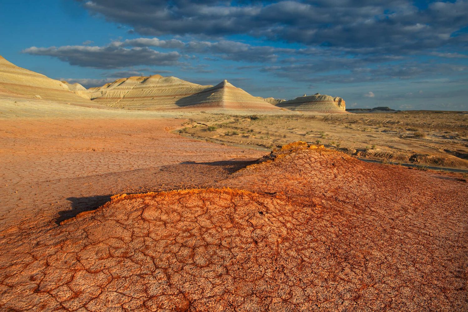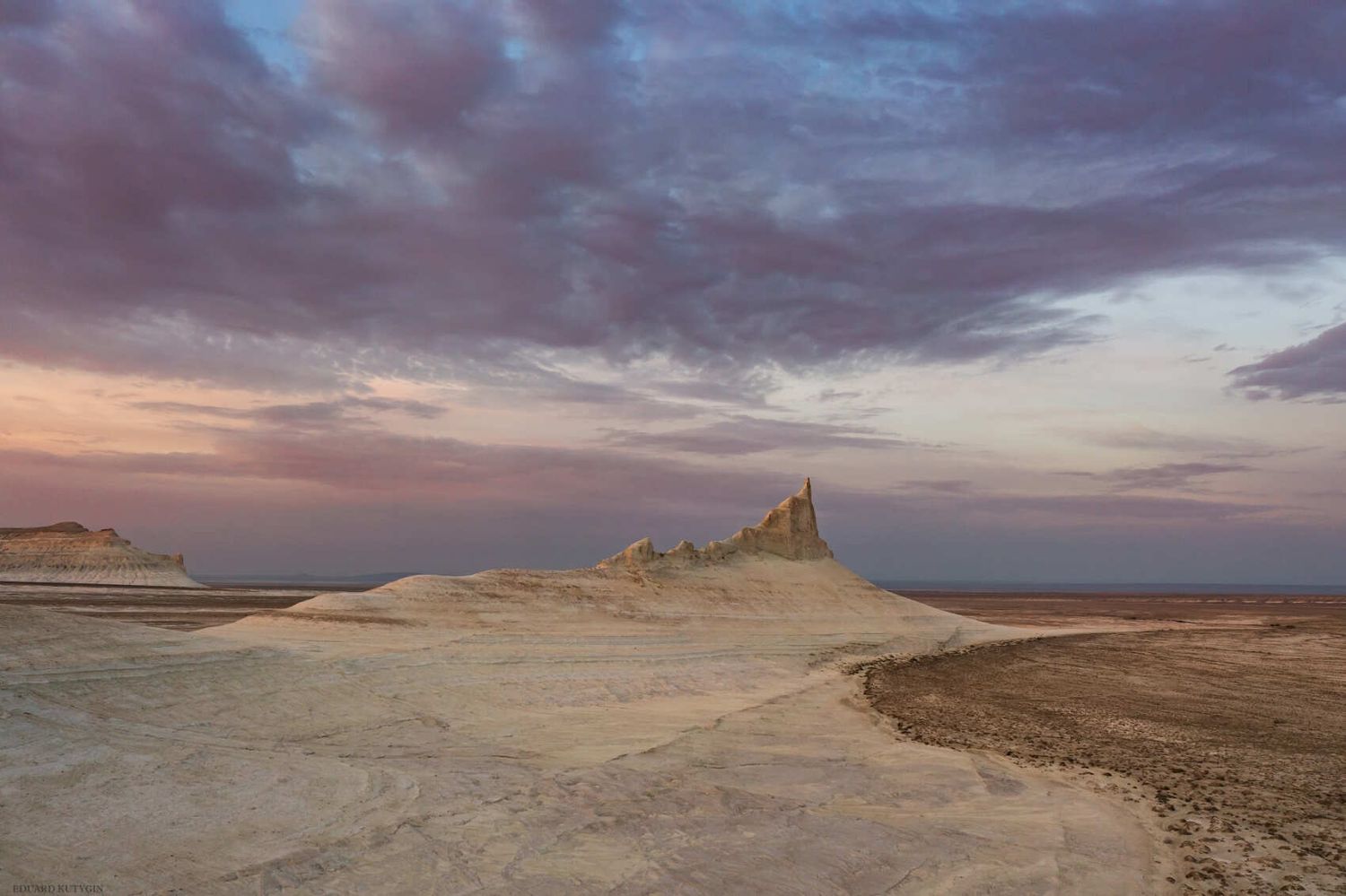 Утренняя фото сессия по разведанным местам. Сворачиваем лагерь и движемся дальше по плато Устюрт. Через 80 км осматриваем младшего брата Актолагай урочище Аккергешен. Аккергешен не менее красив, но значительно меньше по высоте и размеру. После осмотра попадаем в более цивилизованные места и движемся по асфальтовой дороге. Остановка в поселке Бейнеу, обед в кафе, заправка, принимаем душ и движемся дальше. После скучных 500 км приезжаем к грандиозному чинку Тузбаир. Обрыв более высокий, чем в Актолагае, так же срез слоев окружающих чинков имеет не только белый меловой цвет, но и отличается богатой палитрой оранжевого, желтого и синего цветов глин. Здесь есть солончак (сор), в котором мы попробуем найти кристаллы соли, в нижней части обрыва есть природная арка, которую нужно обязательно красиво сфотографировать, а в самом низу затерянный мир причудливых каньончиков, небольших холмиков, останцев и узоров высохшей глины (такыр), где люди бывают очень редко. Ночуем у сора или на высоком месте Тузбаира в палатке. Провожаем закат.