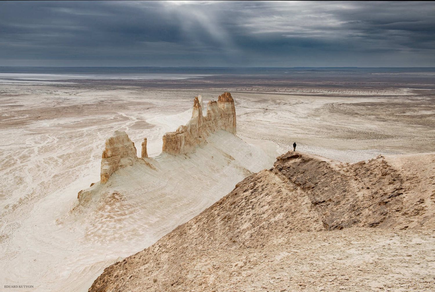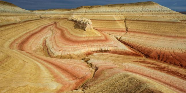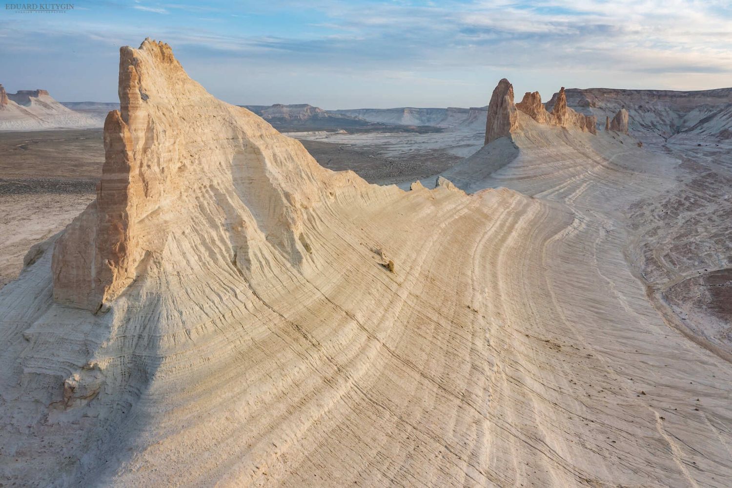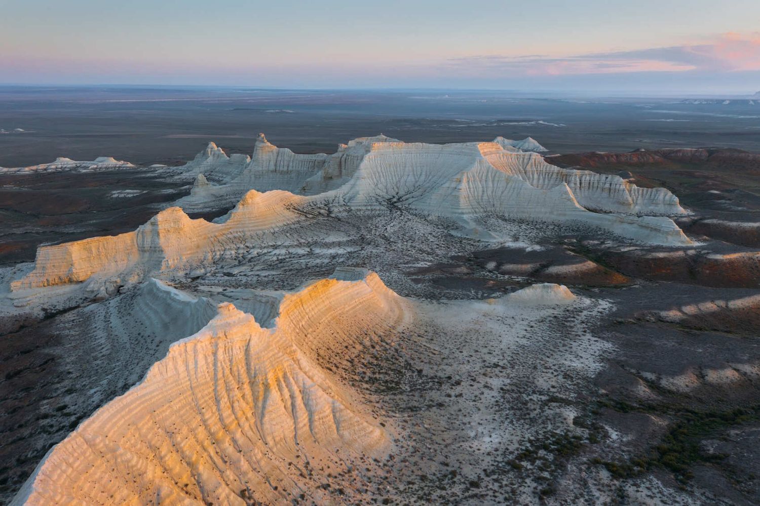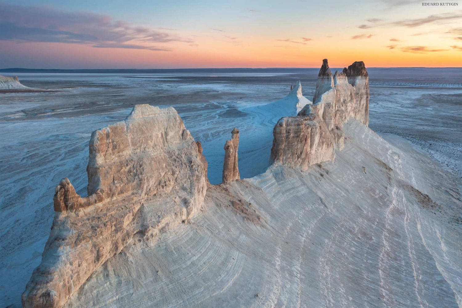 Вся красота сосредоточена в местах разломов земной коры, образовавшихся после подъёма плато Устюрт. Глубокие разломы со временем затянуло осадочными породами, в этих местах получились солончаки, а настоящее чудо это удивительные высокие обрывы, местные их называют чинки.