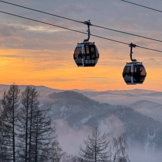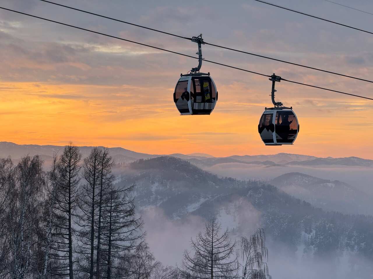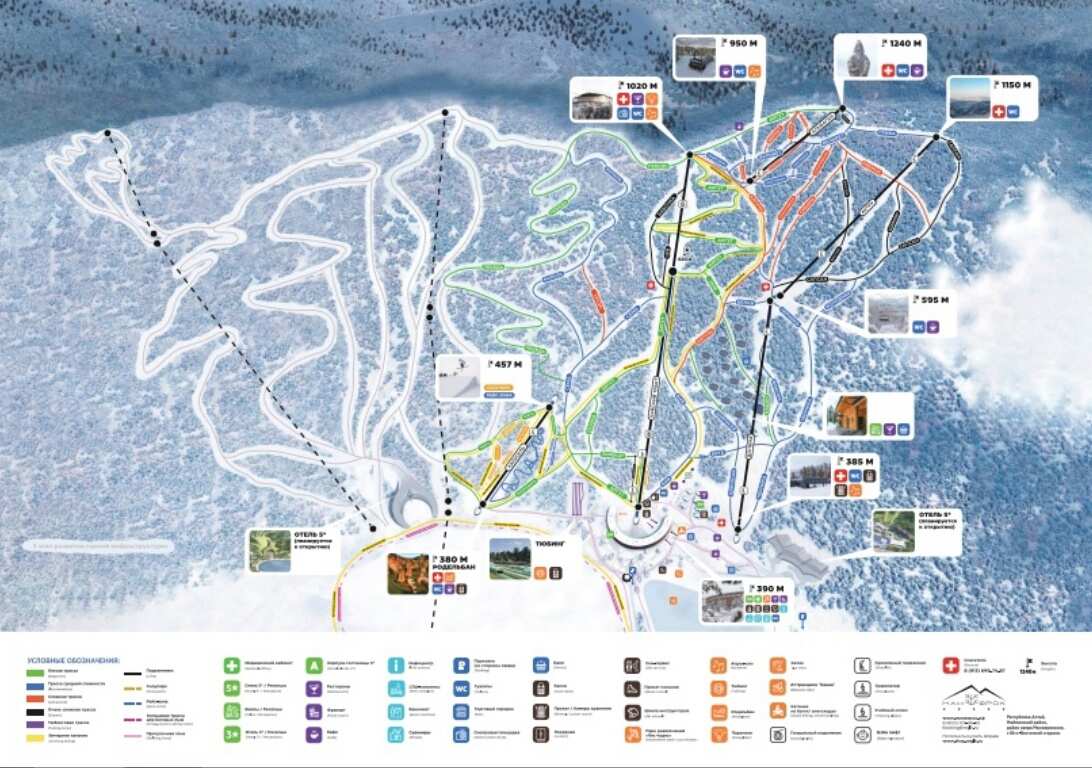 13:00 Возвращаемся на курорт Манжерок. Для начинающих здесь есть учебная трасса. А в 2026 запустили новую канатную дорогу, проходящую прямо над озером! Также можно прогуляться на беговых лыжах вокруг озера, покататься на коньках, бубликах, снегоходах и даже на упряжке с северными собаками!