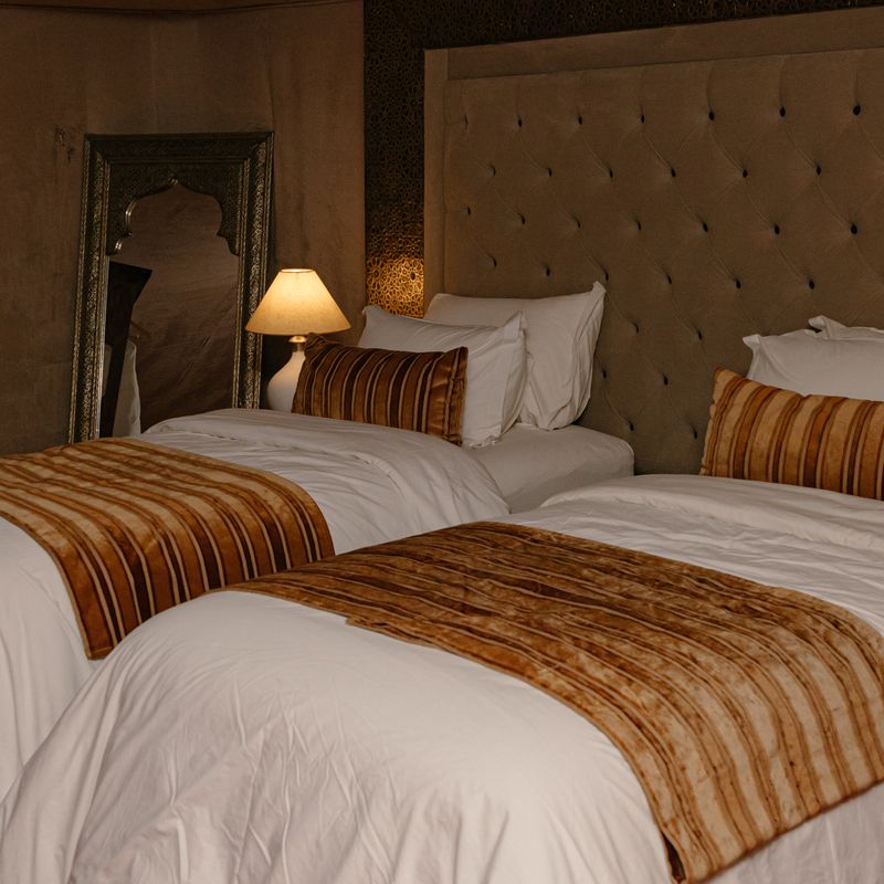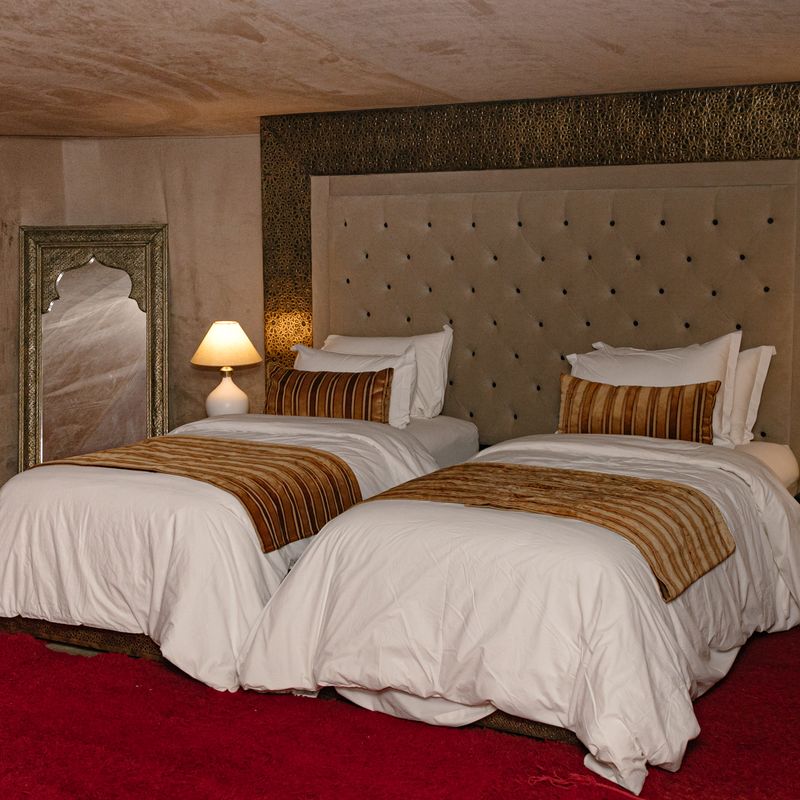На ужин блюда с необычным сочетанием вкуса. А после, посетим берберское шоу с костром, музыкой, танцами и песнями. Полюбуемся неповторимым звездным небом. Переночуем в Сахаре в комфортных шатрах со всеми удобствами и собственной ванной комнатой.
