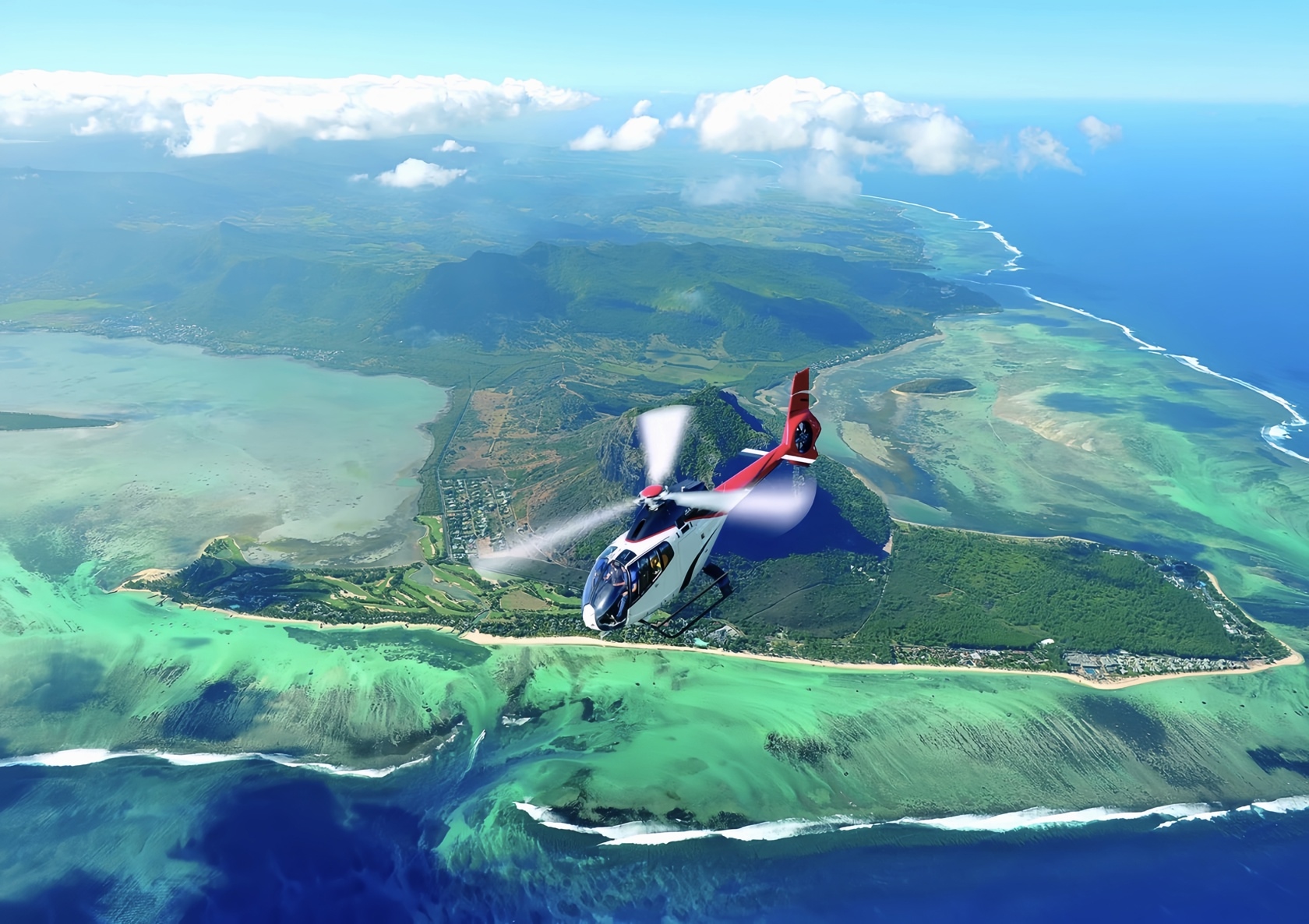 Полетать на вертолёте над лакшери-островом, куда за экзотикой прилетают миллионеры, миллиардеры и звёзды? Изумрудный остров в Индийском океане, бирюзовые воды, белые пляжи в обрамлении пальм и ты.