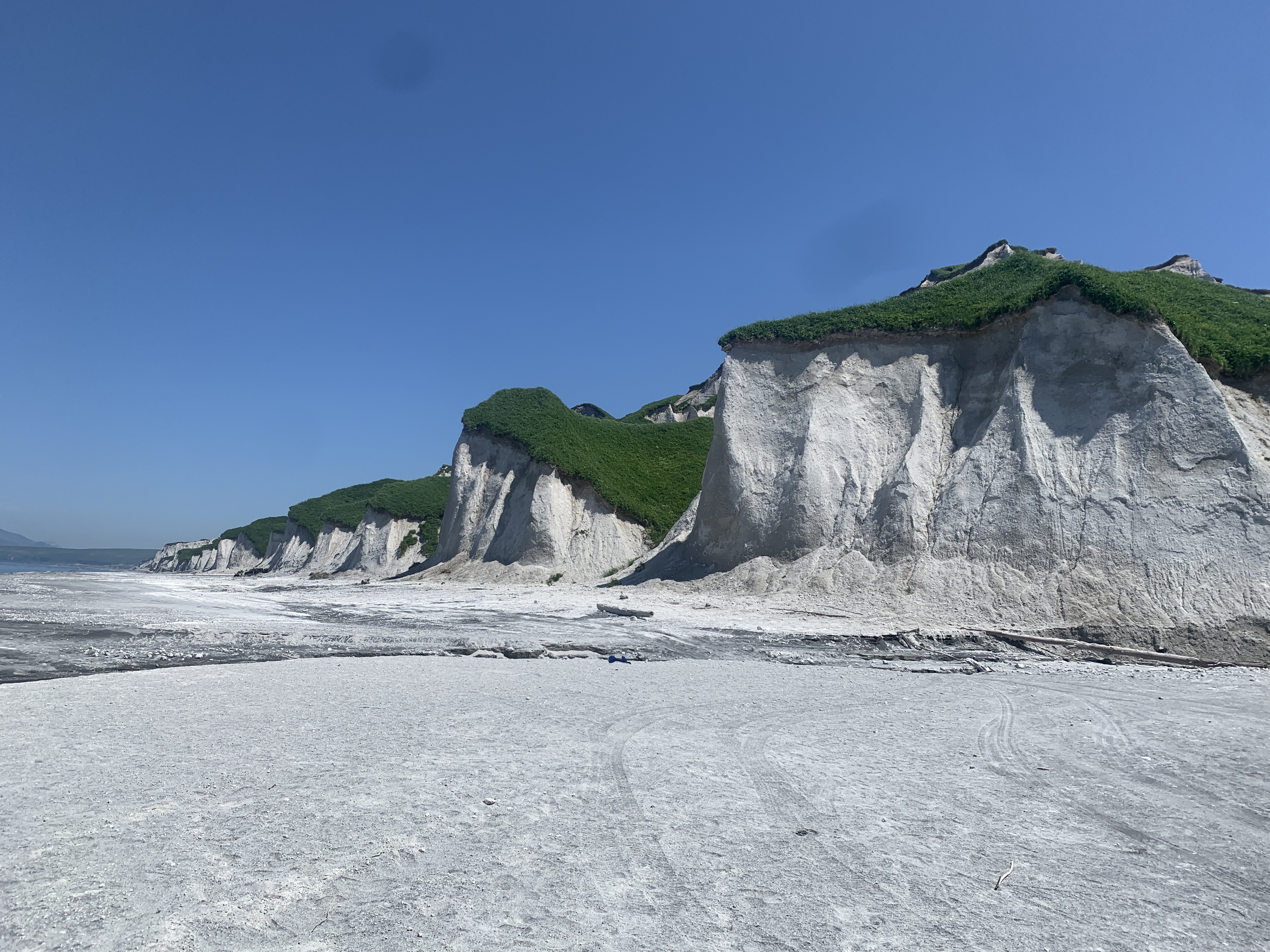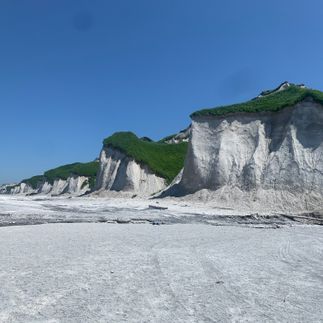Белые скалы одно из самых потрясающих творений стихии в природе.Это уникальные вулканические образования, возникшие из очень легкой и мягкой пемзы, расположенные в северо-восточной части острова Итуруп, растянутые на множество километров, уходящие далеко за горизонт.Белоснежные скалы, покрытые ковром зелени, представляют собой неповторимые волнистые хребты. А местный песчаный пляж удивительно безлюден, что придаёт этому месту космическую атмосферу.В случае отлива в часы проведения экскурсии посещение бухты Парусная, расположенной в нескольких километрах от Белых скал, проехать к которой возможно только по кромке прибоя. В бухте Парусная есть красивейший водопад Девичьи косы, который уникален тем, что его можно обойти по кругу в месте падения воды.В этот день прилагается посещение термального комплекса Жаркие воды, находящегося в 5 км от села Рейдово. Входная плата в комплекс оплачивается дополнительно: 1500р/чел наличными за 1 час купания.Программа дня (время выезда на экскурсию варьируется в зависимости от расписания приливов и отливов залива Простор; посещение термального комплекса Жаркие Воды возможно в утренние часы в случае большой загруженности или сильной жары).