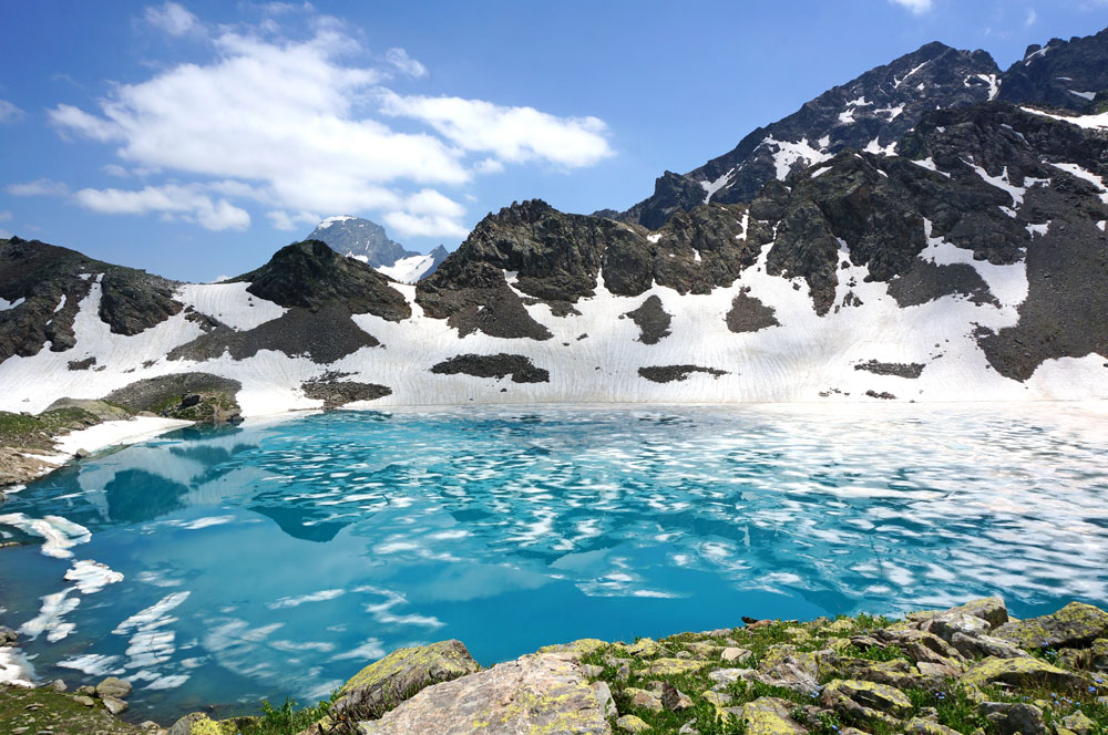 В июле Турье озеро окружают цветущие рододендроны, а по его изменчивой глади всё еще плавают небольшие льдины. Вот вам и контраст Кавказа: лед и пламень в одном кадре.