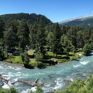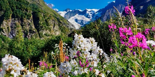 Вскоре подойдем к любимому месту альпинистов - альплагерю Алибек. Далее тропа приведет нас на огромную поляну, на которой в июле всегда цветут всеми красками альпийские луга. Отсюда впервые увидим огромный, белоснежный ледник Алибек. Уникальность этого ледника Домбая в том, что он спускается очень низко в долину, поэтому его можно очень хорошо рассмотреть!