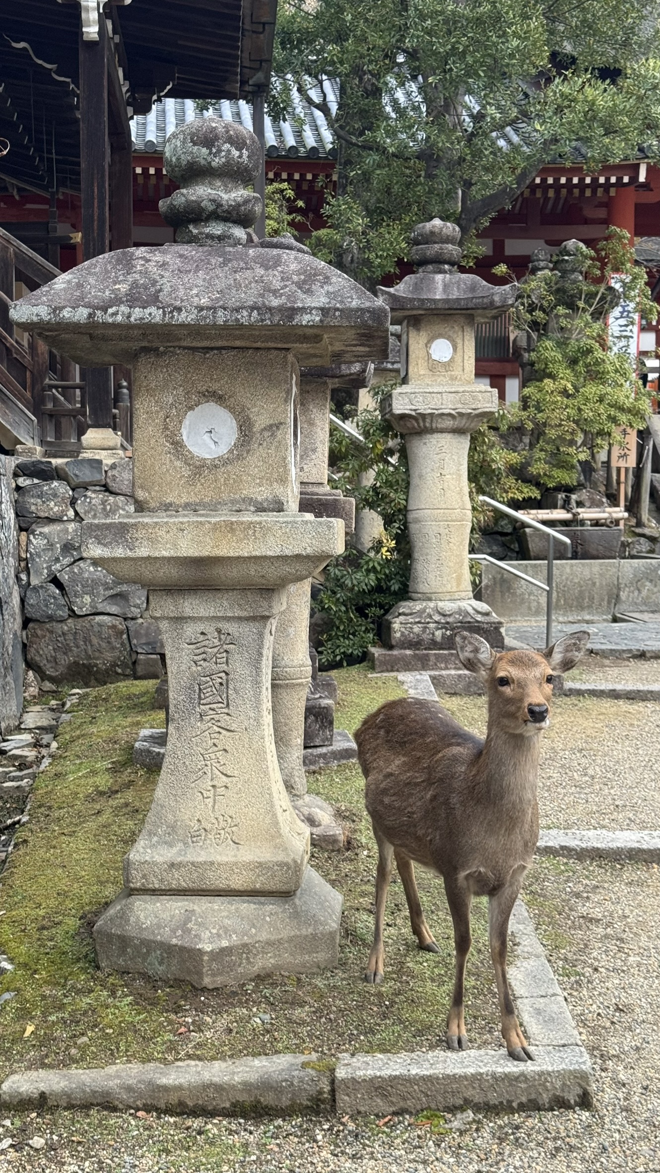А вокруг храма парк, где гуляют главные здешние жители, милейшие олени, которые совершенно не боятся людей, а даже наоборот клянчат у туристов печеньку. После поднятия уровня милоты на сердце, прогуляемся по аллее с замшелыми фонарями до святилища Касуга-Тайся.