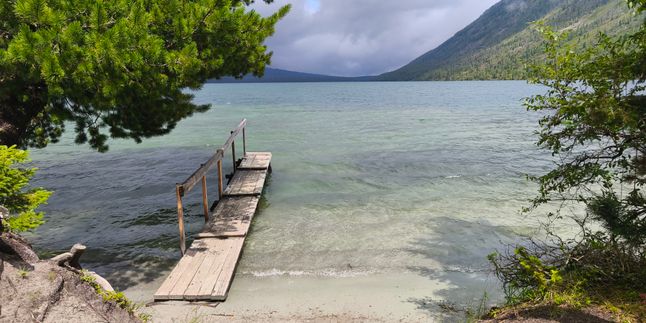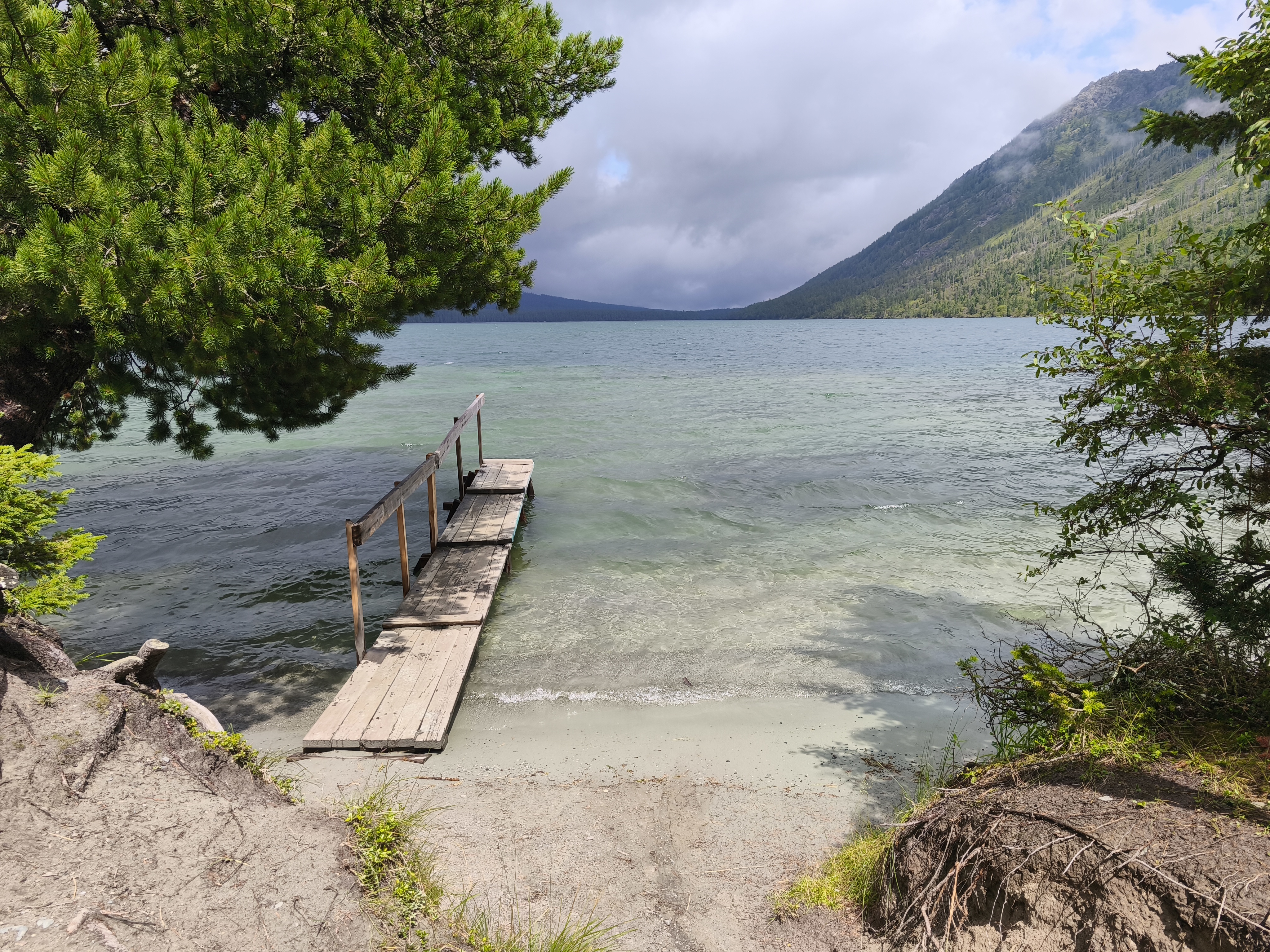 Водоем огромный, вдалеке видны снежные горы, а вокруг, насколько хватает глаз, бесконечные кедровые леса!