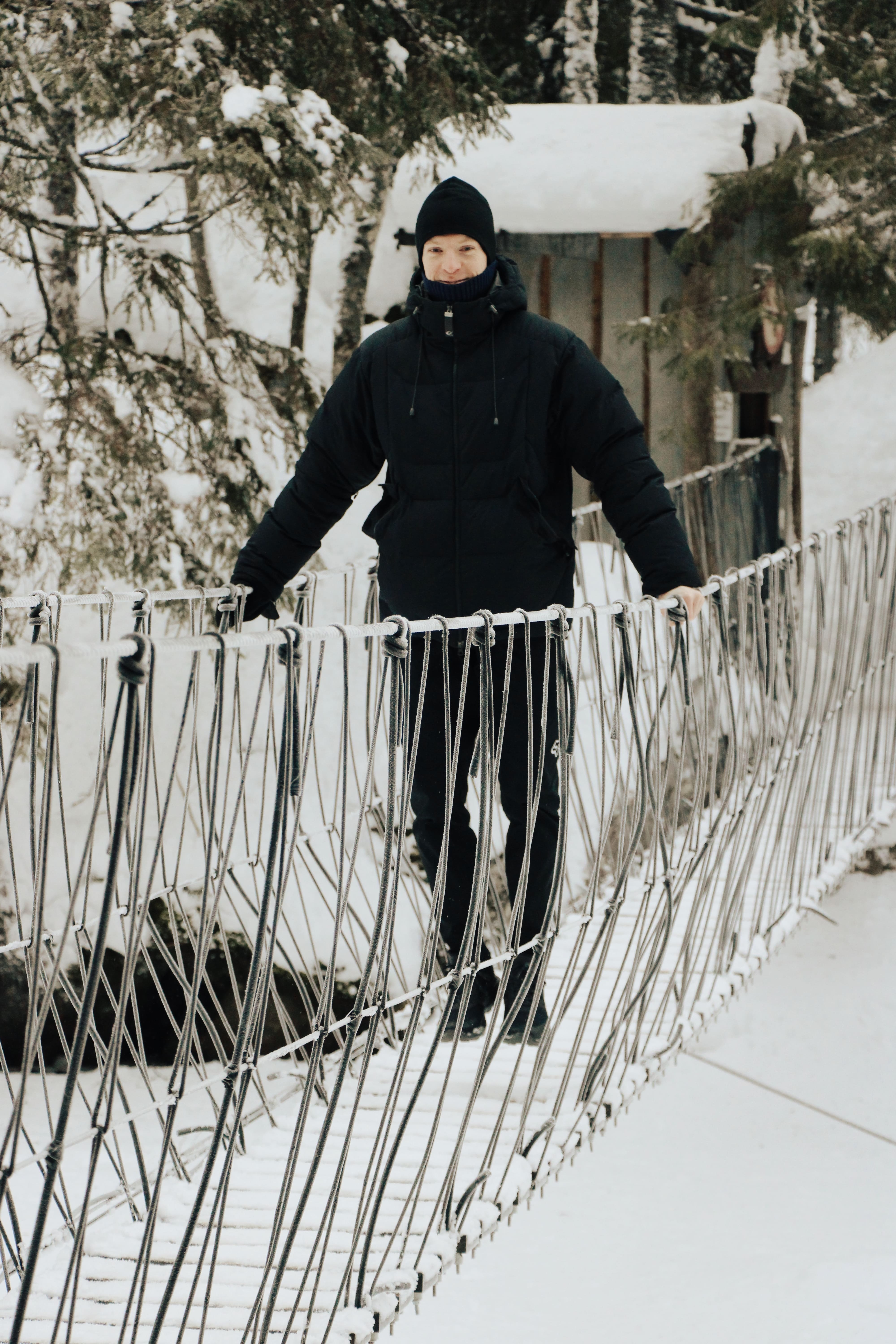 Нас ждёт одно из самых живописных мест этого маршрута — Долина водопадов. К ней ведёт эффектная деревянная лестница, а в конце тропы — точная копия старинной мельницы, стоявшей здесь 200 лет назад. Вокруг — заснеженные ели, шум воды и чистейший морозный воздух.