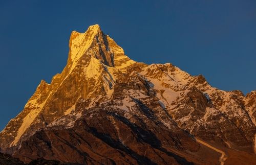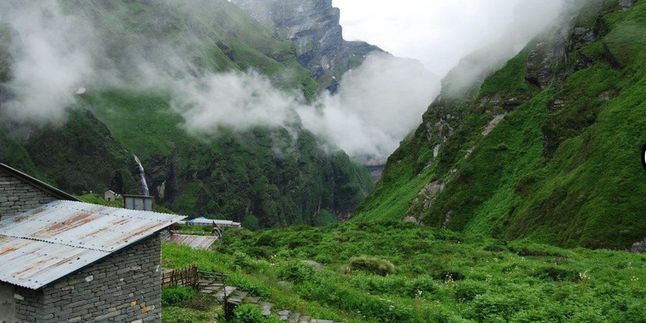 Тропа из лесной зоны переходит в зону альпийских лугов, и пройдя через длинный каньон, окруженный с двух сторон выпирающими, как зубья, огромными скалами, мы постепенно подбираемся к нашему сегодняшнему месту ночлега. Это большой гостевой дом у подножия горы Мачапучре - легендарной священной горы, пик которой имеет необычную форму рыбьего хвоста. Нас со всех сторон обступают крутые склоны гор, и приходится задирать голову, чтобы увидеть небо. Последнее восхождение на Мачапучре было предпринято в 1957 году английской экспедицией. Тогда альпинисты повернули назад, не добравшись до вершины 50 метров, так как правительством Непала запрещено подниматься на пик этой горы - считается, что там живет бог Шива и простым смертным туда вход закрыт.