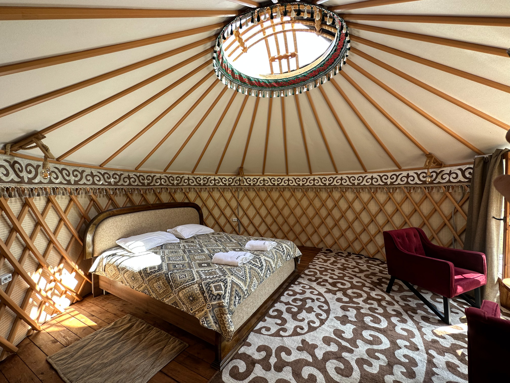 Вечером остановимся в Vip - юрточном городке в горном ущелье Чон Кемин. Вид с террасы каждой юрты завораживает. Все удобства (душ с горячей водой и туалет в каждой юрте).