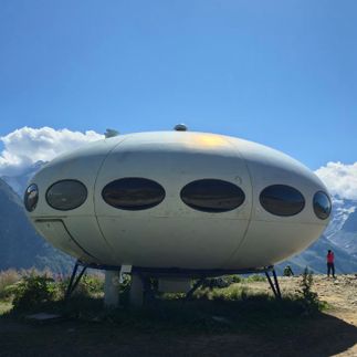 Выходим на станции канатки. Перед нами знаменитый отель Летающая тарелка (гостиница Тарелка), приземлившийся прямо на склоне. Это место стало символом Домбая. Смотровая площадка: панорама Кавказского хребта Эльбрус, пик Инэ, Софийские ледники.