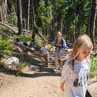 10:00 Выход на тропу к Бадукским озёрам. Вся команда (и дети, и родители) отправляется в путь. Тропа идёт через сказочный лес, вдоль шумной реки, мимо вековых сосен. Капитан Флинт идёт впереди, периодически сверяясь с картой и подбадривая отстающих.