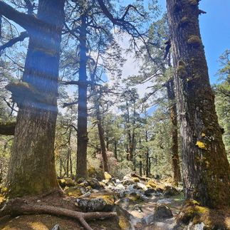 Мы спускаемся в мир, где снова слышны звуки рек и стрекот насекомых. Луга сменяются густыми лесами рододендронов и сосен, горный холод постепенно уступает место мягкому теплу. Путь местами крутой, но каждый шаг приближает нас к новым краскам и ароматам нижних долин.