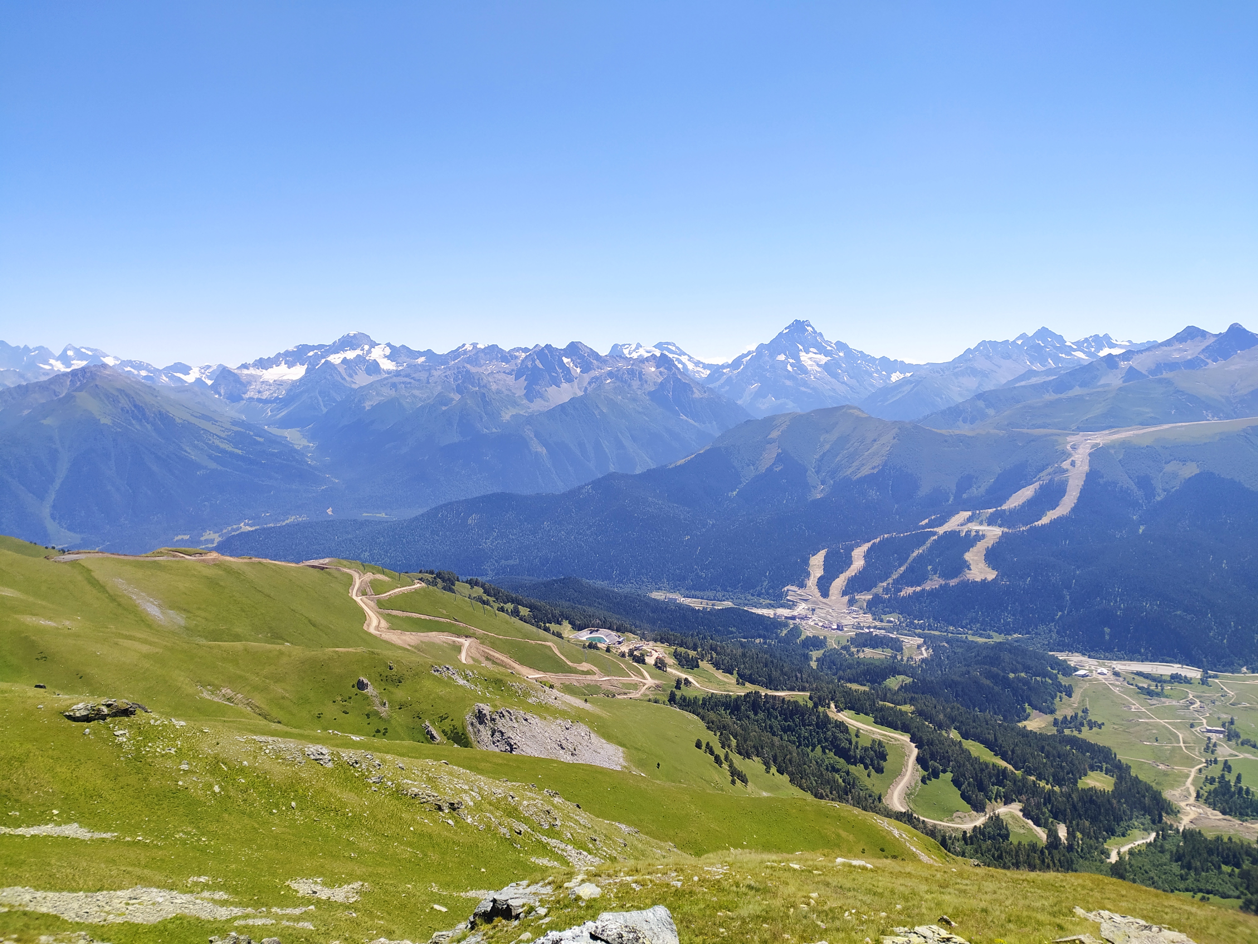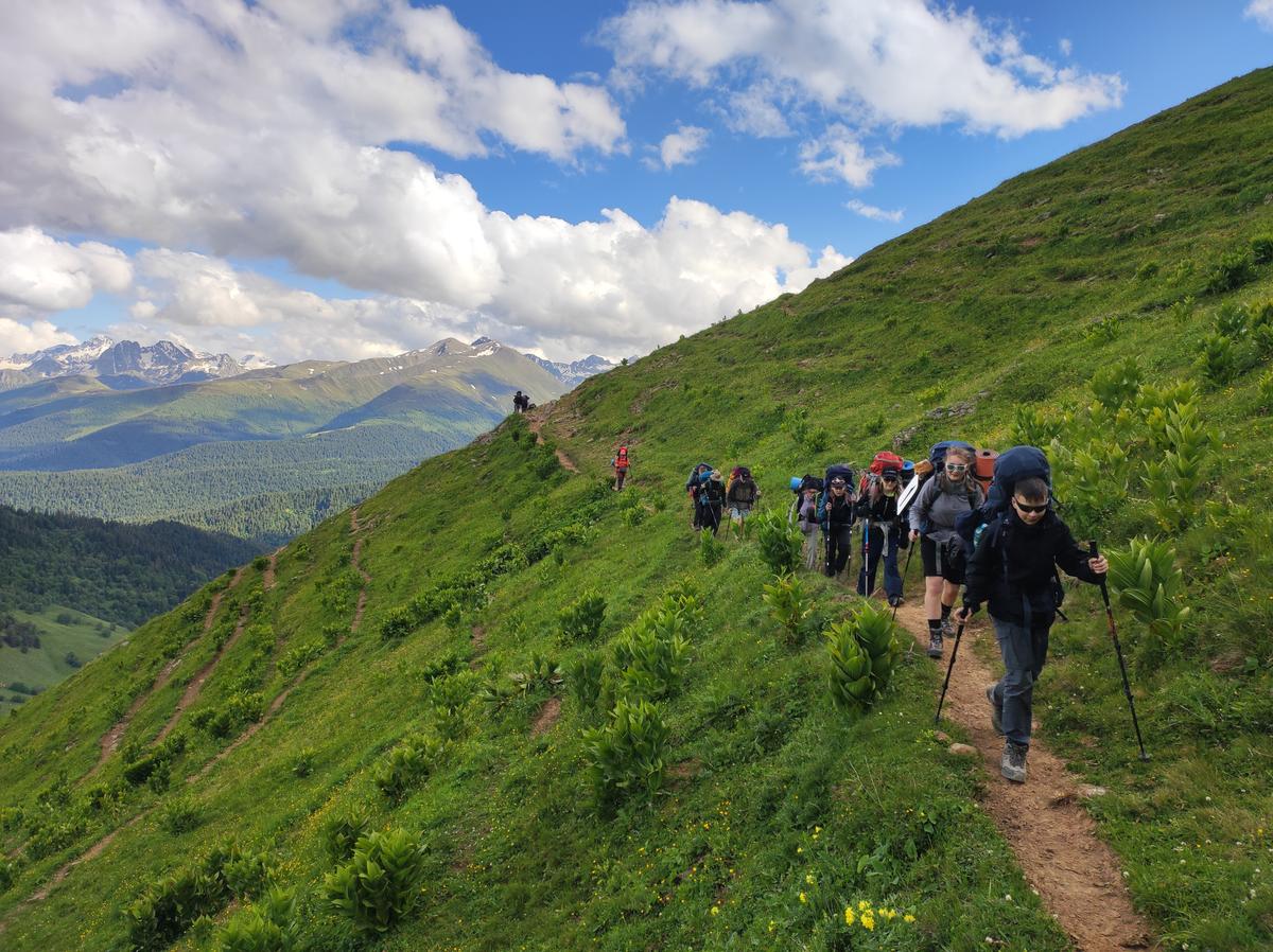 День: подъём на канатной дороге Млечный путь. Выход на маршрут. Переход по склону хребта Абишира-Ахуба. Обед. Подъём на перевал Федосеева.