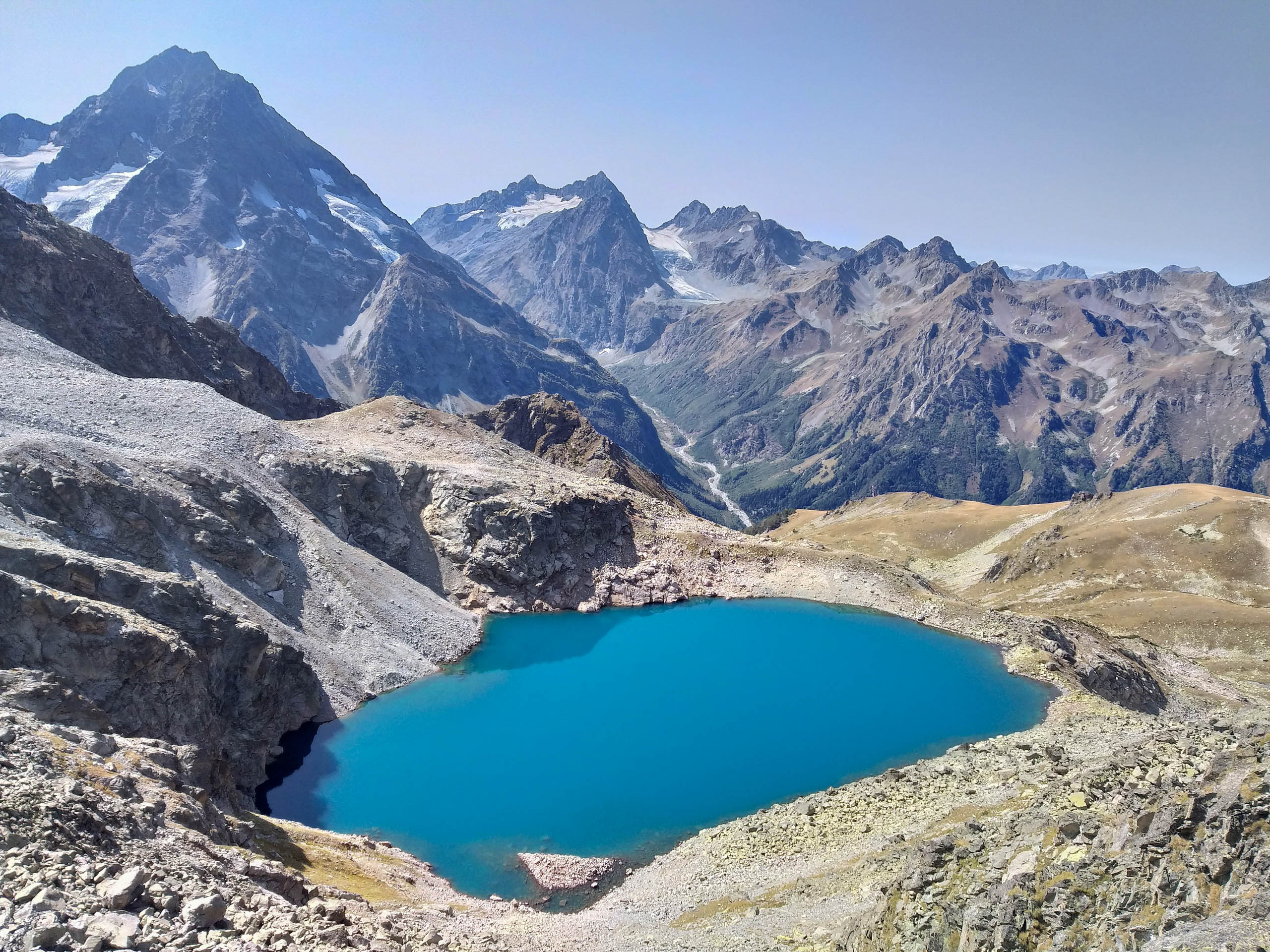 Далее спускаемся в округлую котловину к озеру Кратерное (2830 м). Оно крупное, обрамлено высокими скалами и напоминает настоящий кратер. Вода в озере прозрачная, голубая, очень холодная — даже летом у берегов остаются снежники. Над озером нависает скалистый купол вершины Минги-Кель-Баши — отличное место для фото и отдыха.