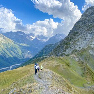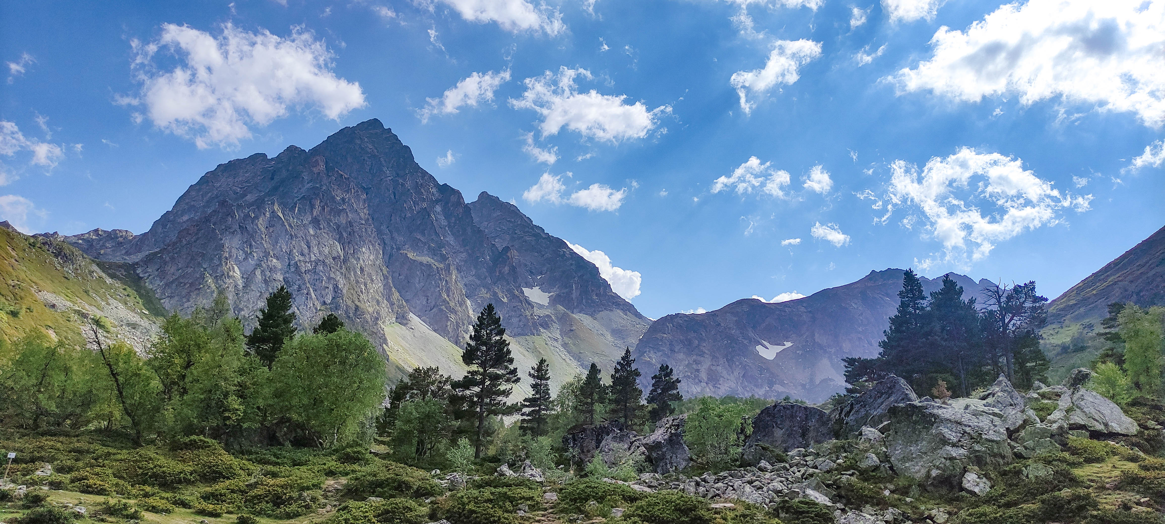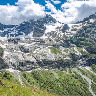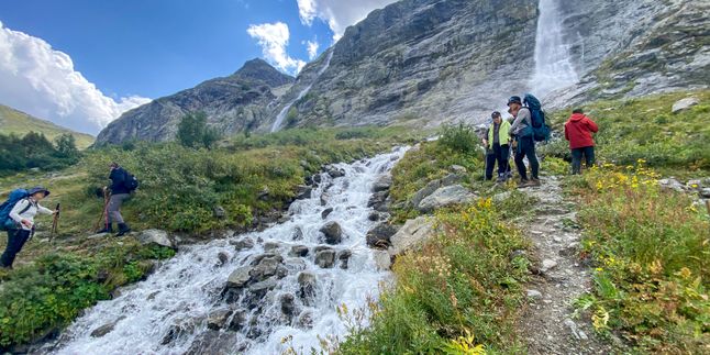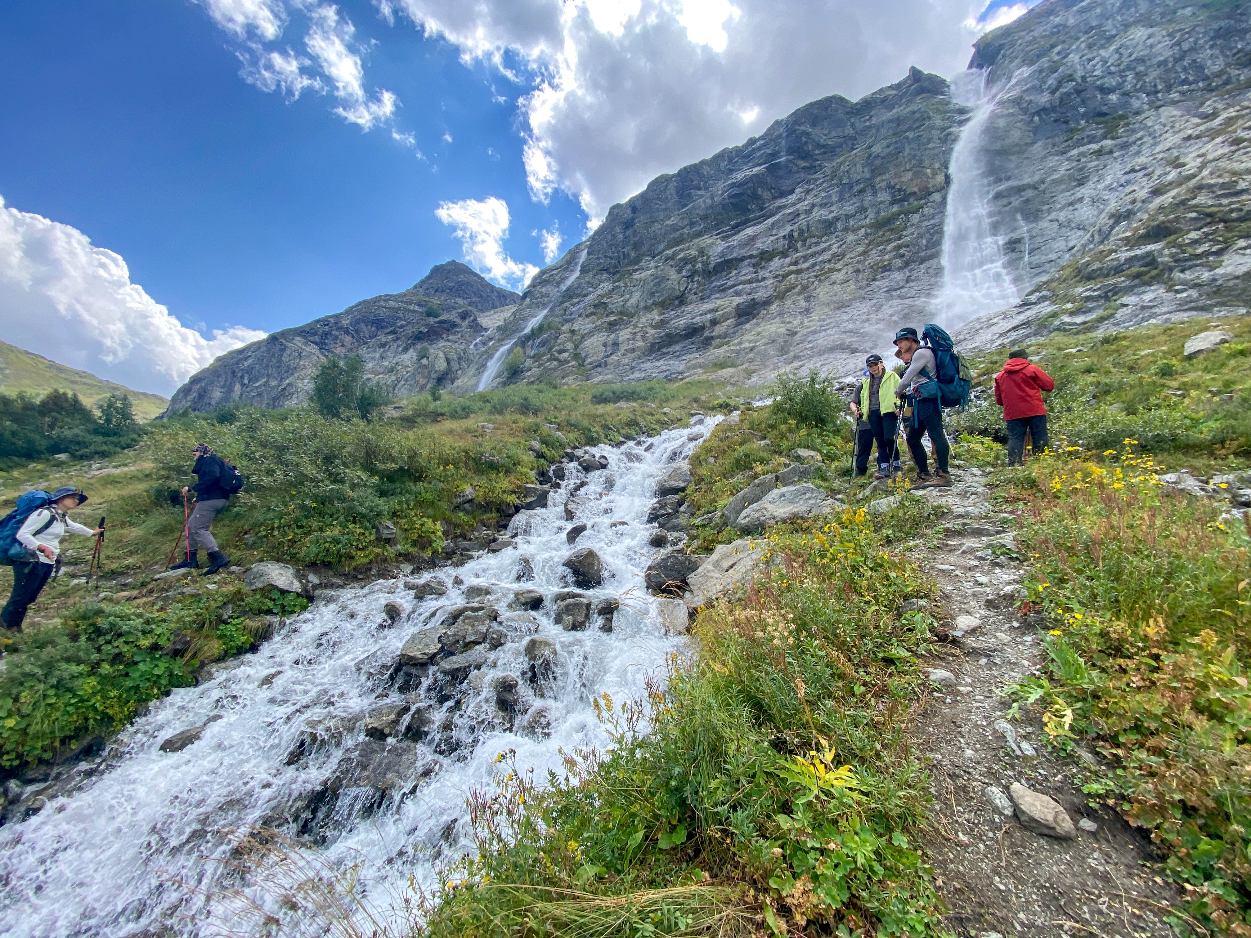 Сначала поднимемся к Софийским водопадам — тропа проходит через берёзовые рощи, ручьи и лес, который постепенно сменяется каменистыми участками и снежниками. С каждым шагом — всё более завораживающие виды на долину реки София. Обязательно оглянитесь назад!