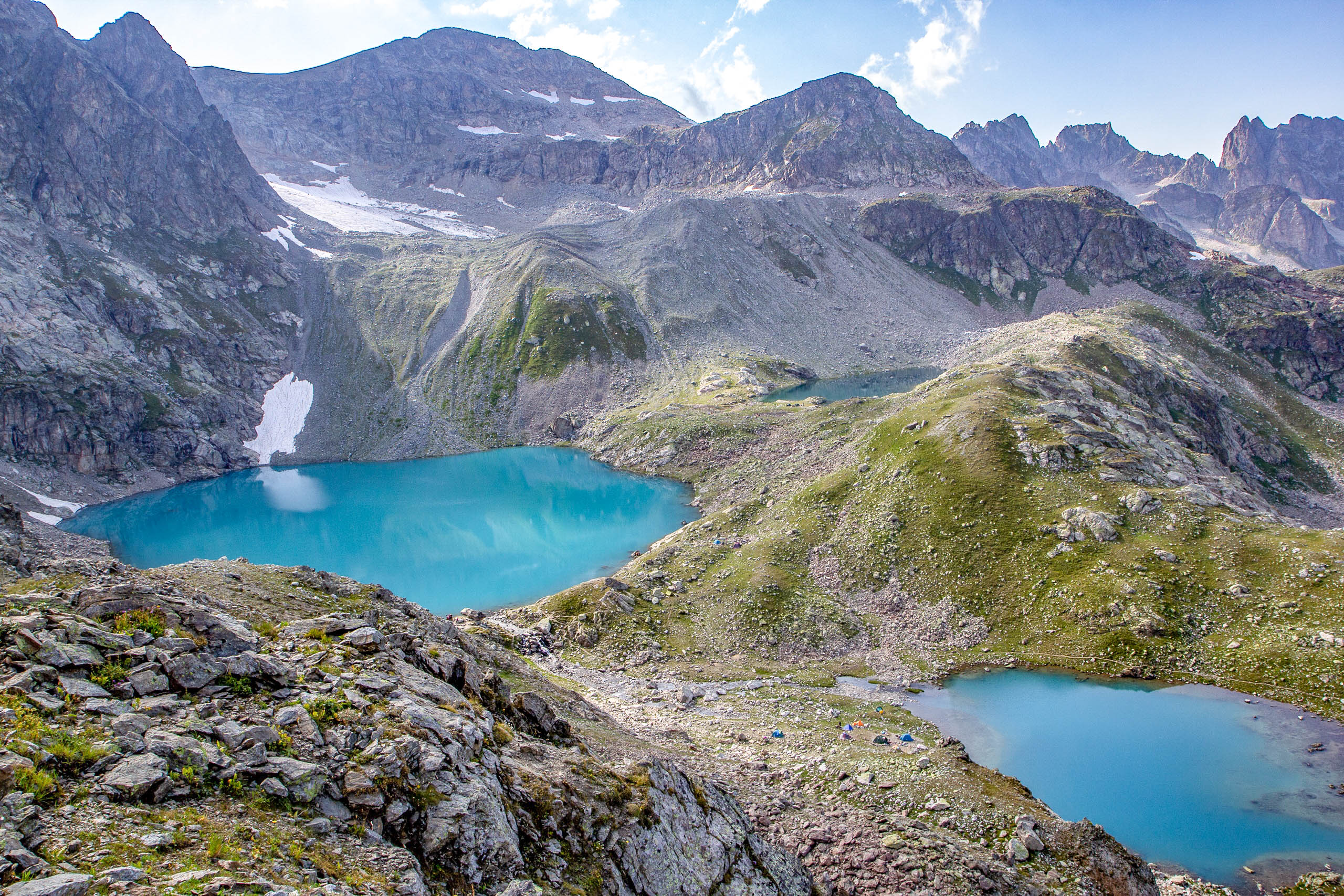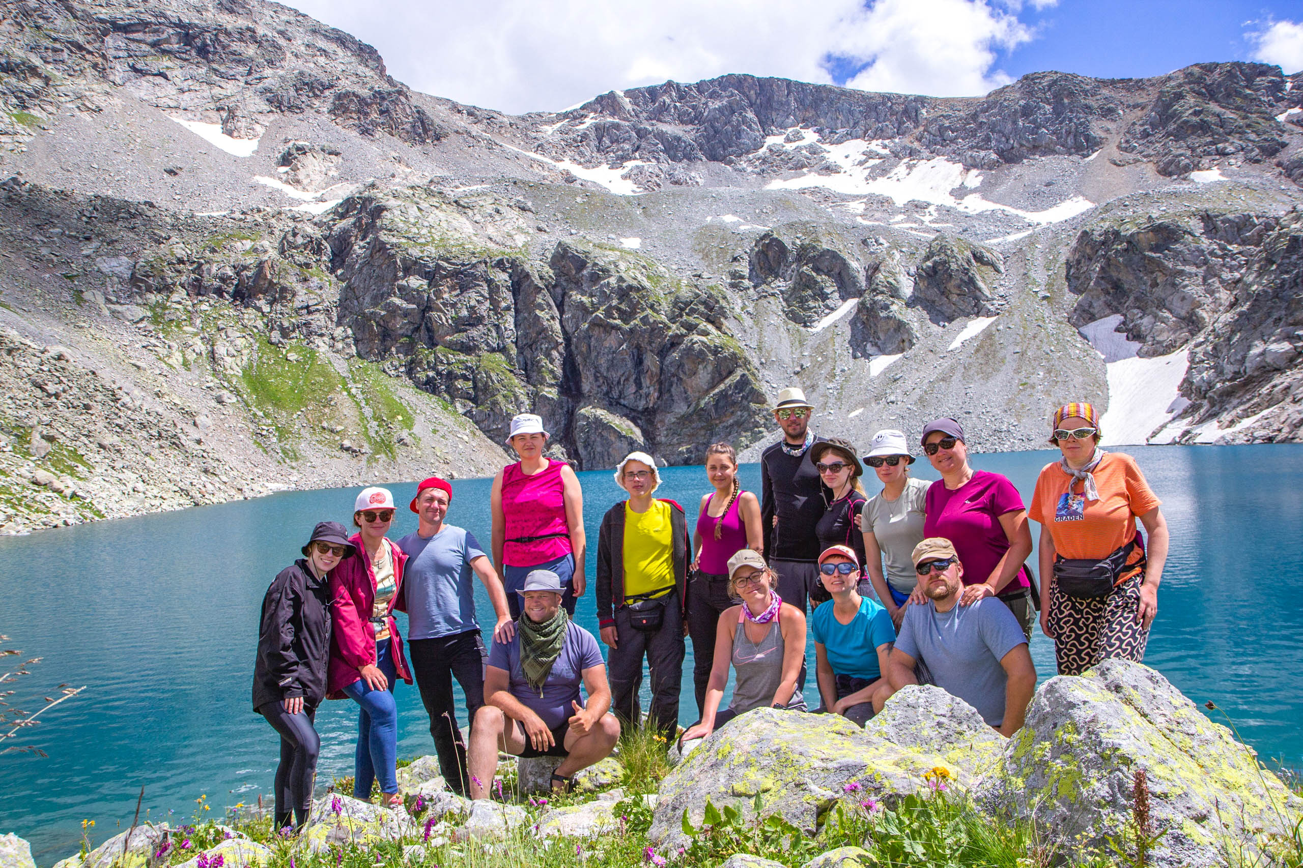 Впереди — подъём на перевал Иркиз (2880 м, 1А). Участок непростой, но наградой станет вход в настоящую страну озёр. Здесь дух захватывает от красоты: Софийские озёра сверкают яркими красками. Одно — насыщенно-голубое, другое — бирюзовое, третье — стальное. В начале лета они ещё украшены снежниками и льдинками.