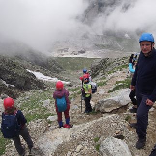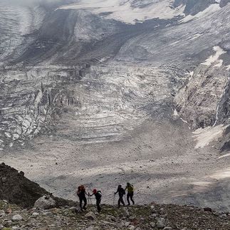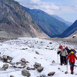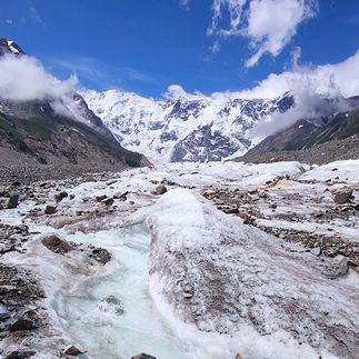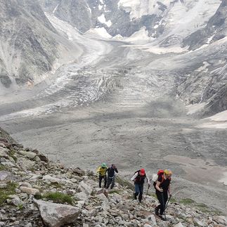 Сегодня начинается самая серьёзная часть нашего путешествия - выходим на крупнейший ледник России и Европы Уллу-Чыран (Безенгийский).Чтобы добраться до открытого льда, предстоит аккуратно пробраться под осыпающейся стеной правой морены. Выйдя на лёд, уделим время ледниковому рельефу, осмотрим трещины и воронки.