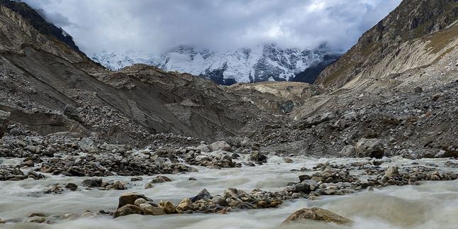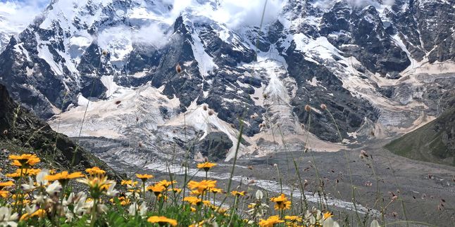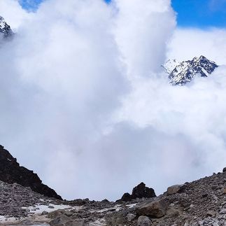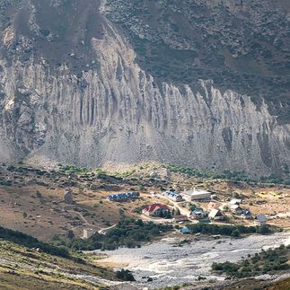 После сбора лагеря выберем безопасную траектория пересечения ледника. Аккуратно обойдём все трещины и выйдем на правую морену ущелья. На этой стороне нас встречает удобная натоптанная тропа, по которой спустимся к месту нашей сегодняшней стоянки - ночёвкам Под Укю.