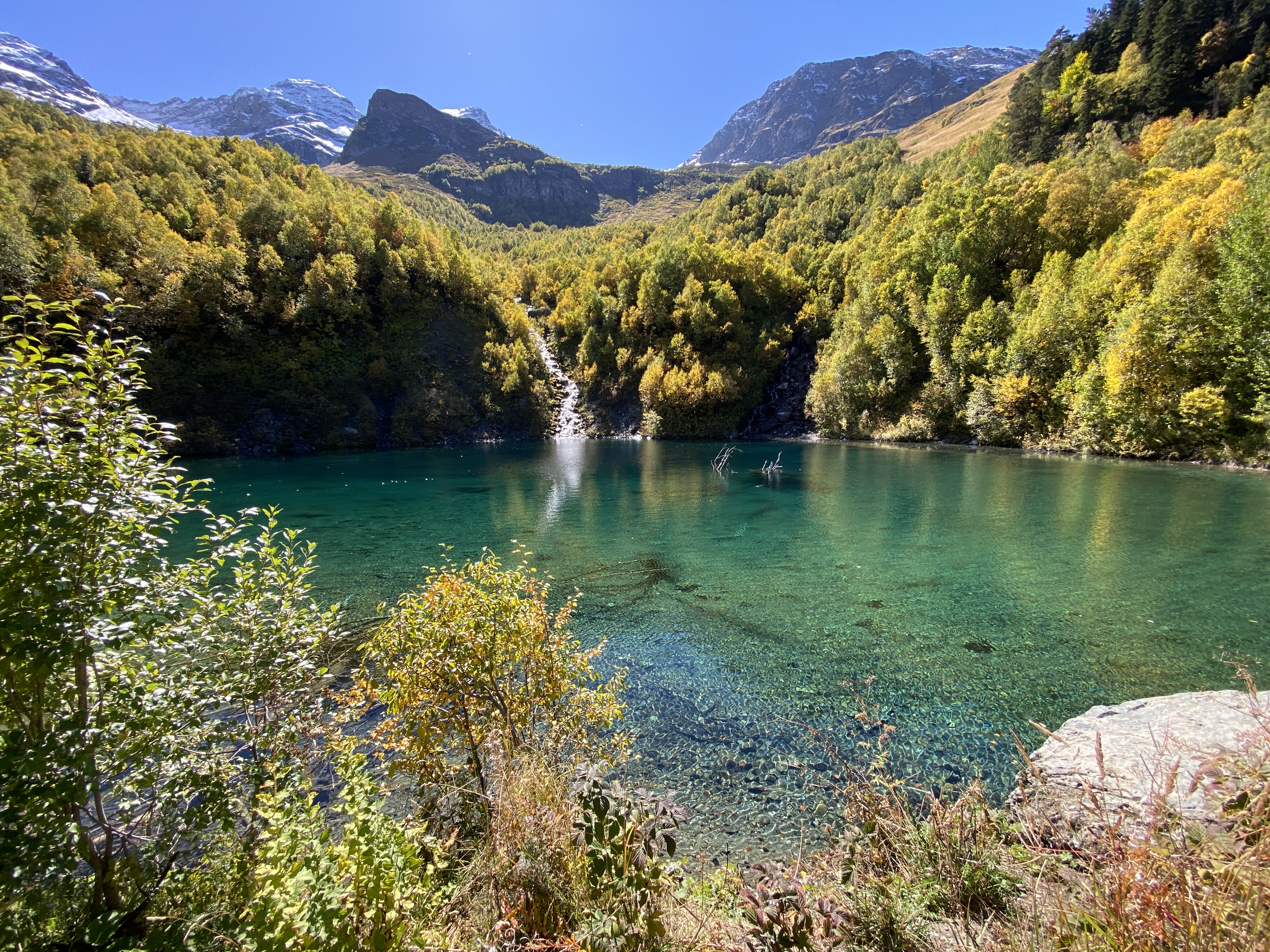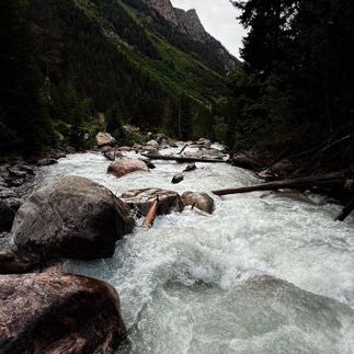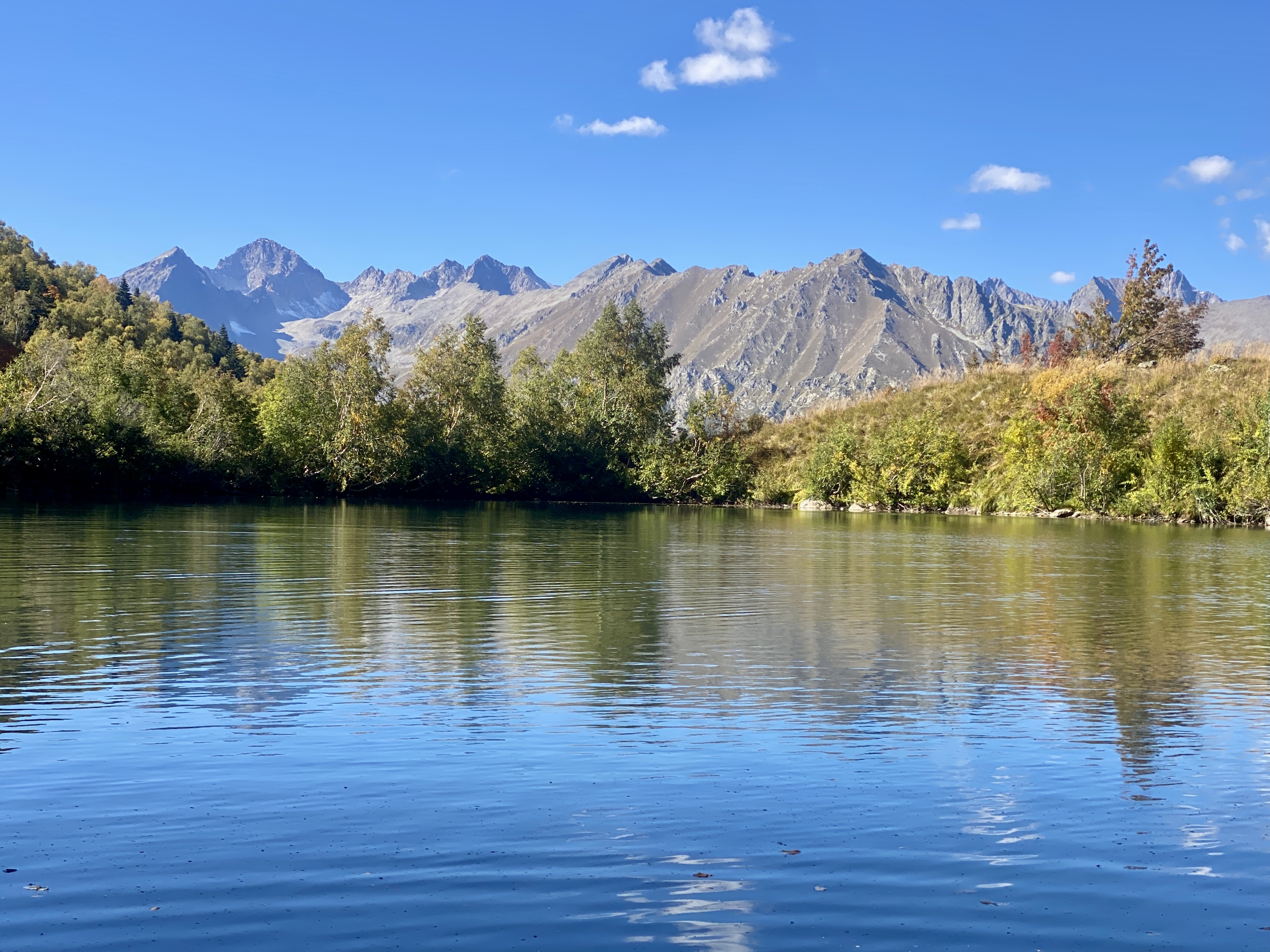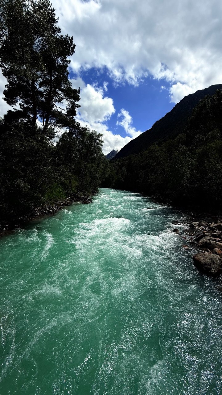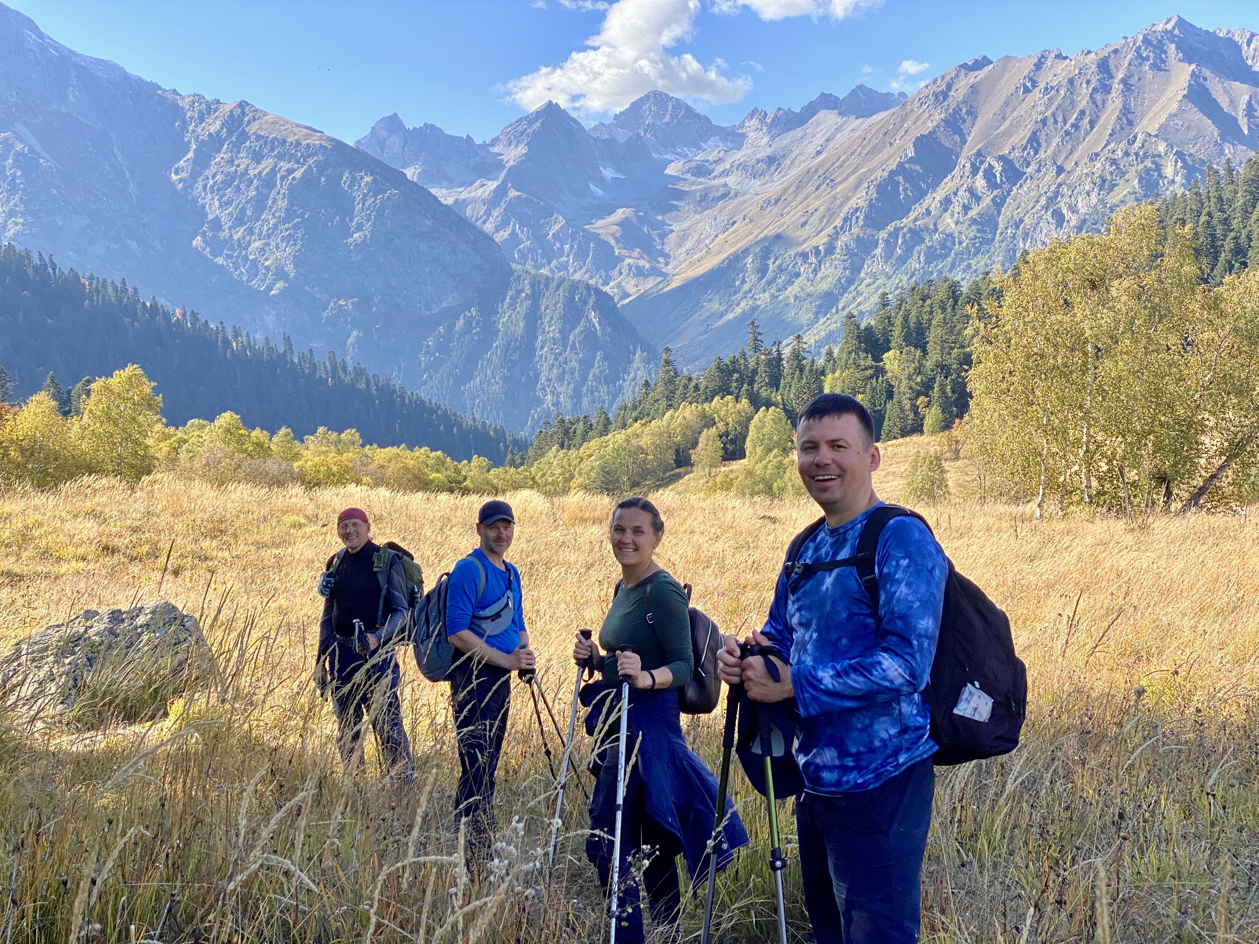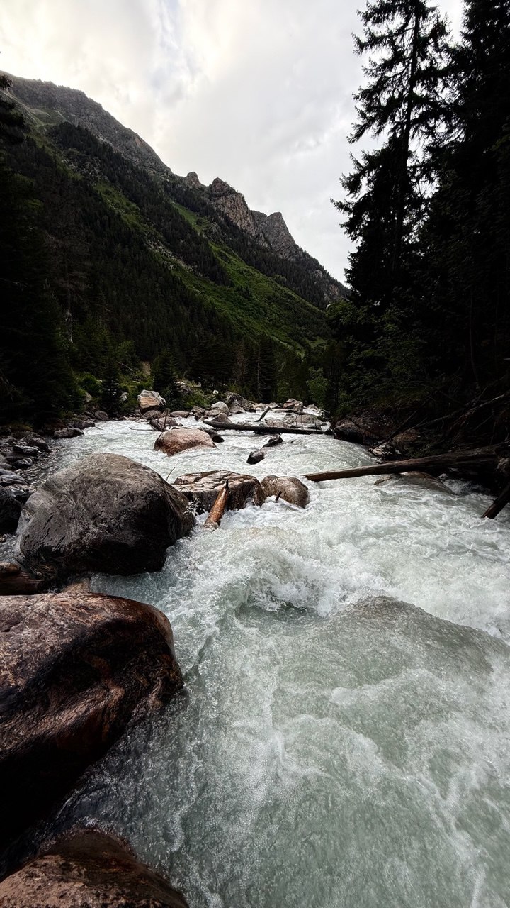 Утро начинается с трансфера к подножию хребта Мусса-Ачитара. Автомобиль останавливается у начала маршрута, и дальше путь продолжается пешком. Здесь начинается треккинг к высокогорным озёрам, одному из самых выразительных природных комплексов Домбая.