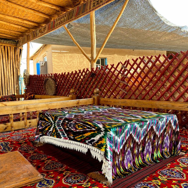 Дальше — заселение в юртовый лагерь: настоящая кочевая атмосфера, но с комфортом, который важен для сна и восстановления (тепло, чисто, всё организовано). После обеда — самая кинематографичная часть дня: караванный опыт. Садимся на верблюдов и выходим к озеру Айдаркуль, окружённому песками. Здесь можно просто молчать и смотреть — или искупаться: вода действительно яркая и очень чистая.