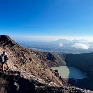 Восхождение на вулкан Горелый займет примерно 4-5 часов. Наверху мы пройдем по самому крупному и известному кратеру, где на дне находится кислотное озеро бирюзового цвета.