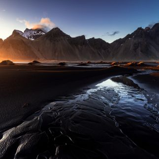 Черный вулканический пляж Рейнисфьяра — цвет которого связан с расположенным неподалёку вулканом, лава которого при извержении попадала в океан, и в последствии застывшая черная лава размывалась, превращаясь в чёрный вулканический песок, который и выносился на берег.