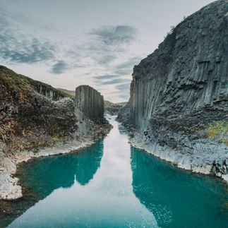 Каньон Студлагил образованный рекой Йёкюльсау-ау-Бру и известен базальтовыми образованиями и водой голубого-зелёного цвета, текущей сквозь него.