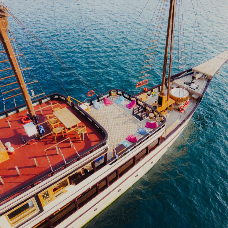 - Морской Круиз на традиционном корабле Пиниси с собственной или шеринг каютой, оборудованной кондиционером. Джакузи, Сан-дек, мягкие пуфы для отдыха.