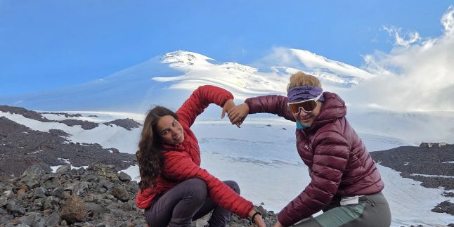 Оставив вещи в лагере, отправляемся к самому Эльбрусу! Подходим к леднику, где лед переливается синевой, а воздух становится особенно чистым. Вид на гигантскую вершину заставляет замирать сердце. Вечером — финальный мастер-класс и последний шанс увидеть падающие звезды: теперь мы уже опытные звездочеты!