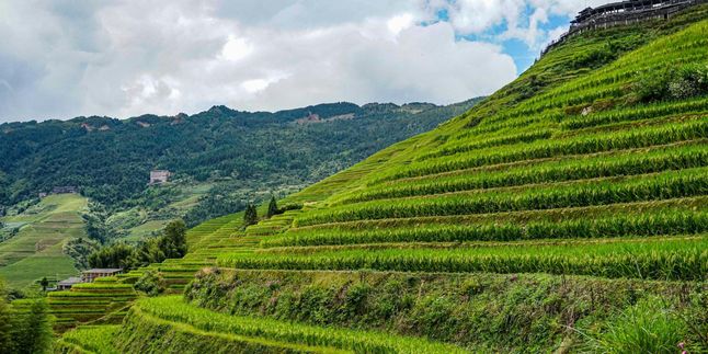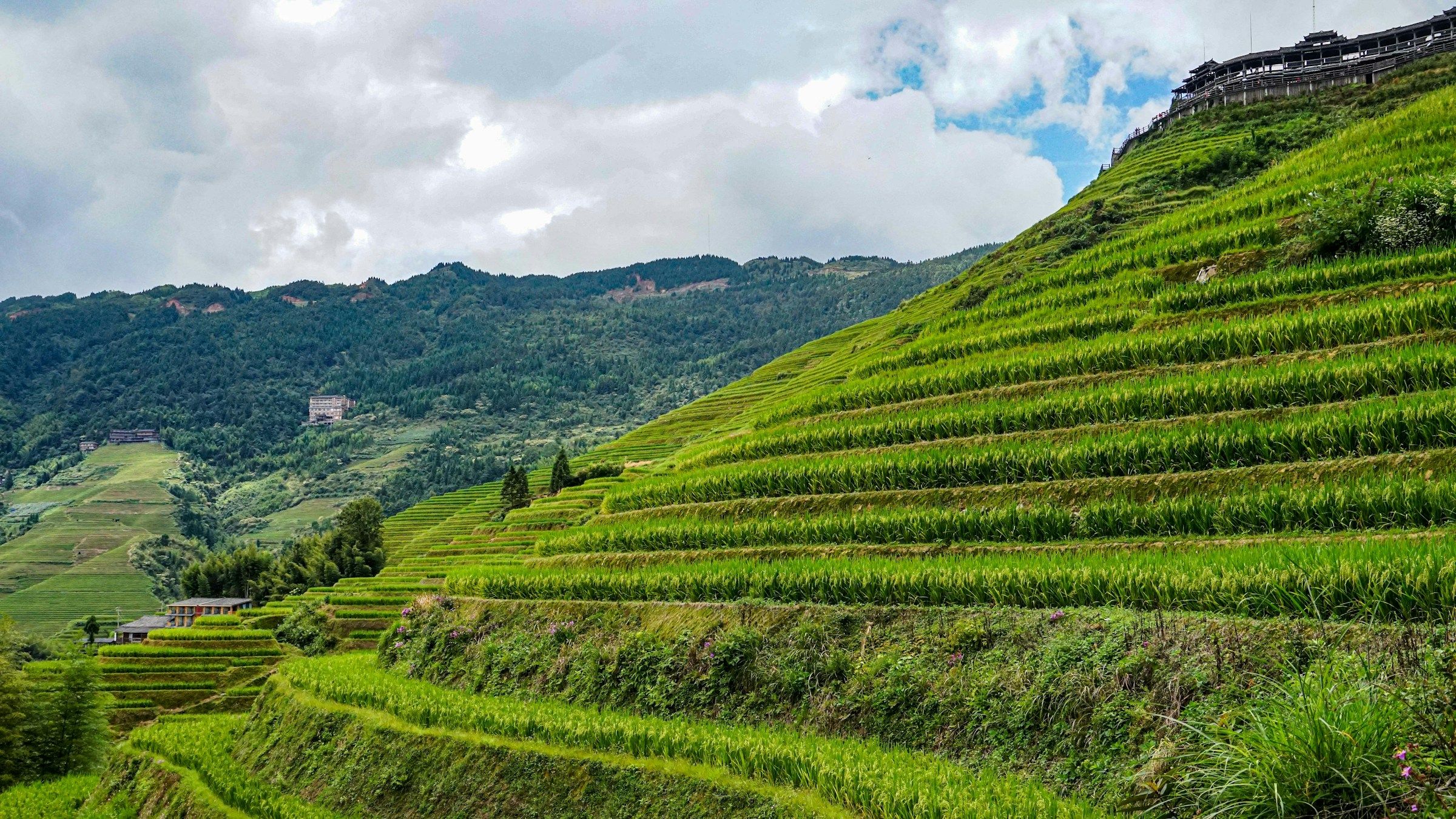 Далее поднимемся в район Цзинькэн Дачжай, откуда открываются самые впечатляющие виды на террасы. Смотровые площадки позволяют увидеть, как горы словно обвиты зелёными лентами рисовых полей. Это зрелище по праву называют одним из самых красивых пейзажей Китая.