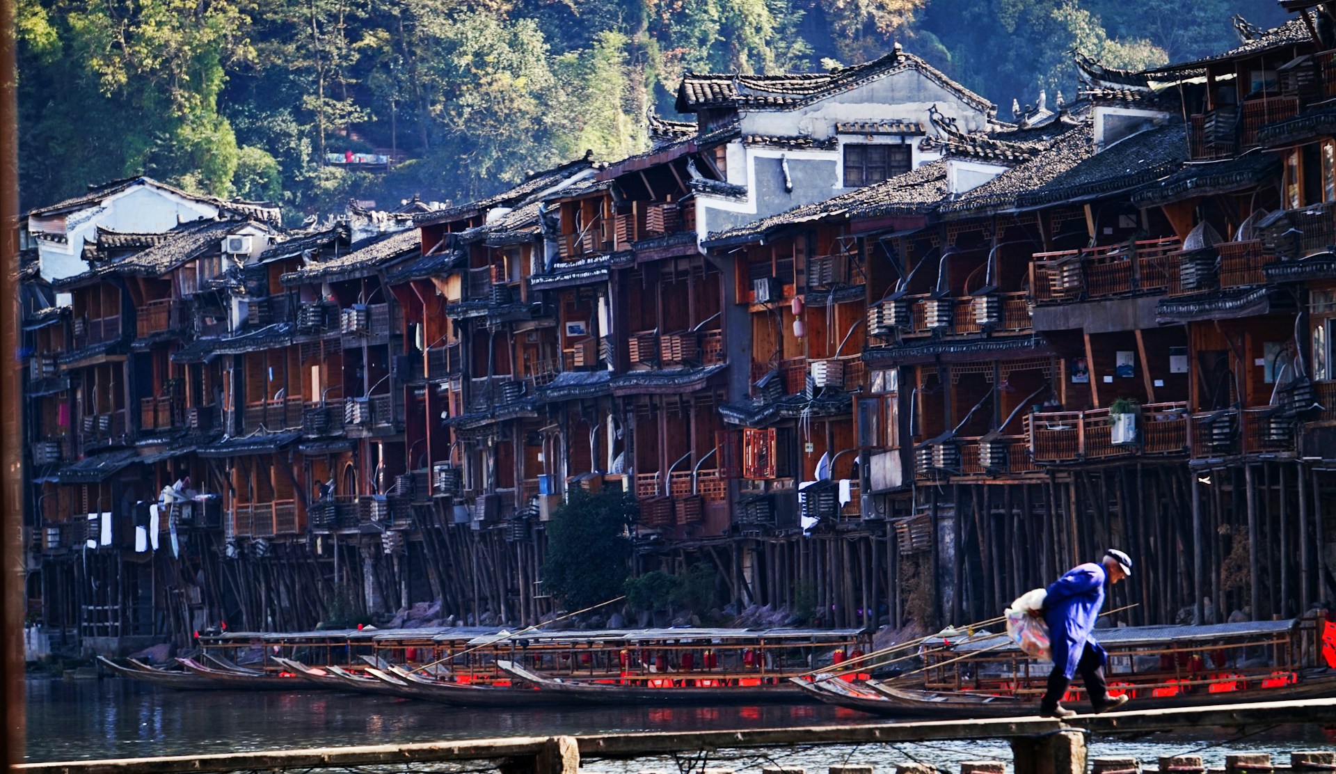 Фэнхуан, или Город феникса, считается одним из самых красивых старинных городков страны. Его улочки, мощёные камнем, деревянные дома на сваях и мосты через реку Тоцзян создают ощущение путешествия во времени. Здесь каждый уголок словно сошёл с китайской акварели: фонари отражаются в воде, а над рекой тянутся узкие пешеходные мостики.